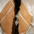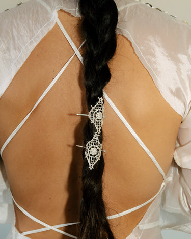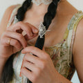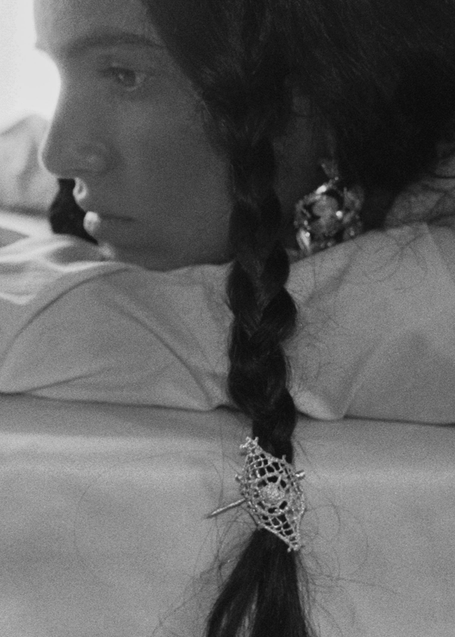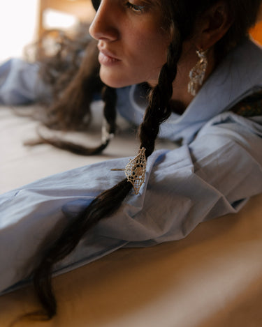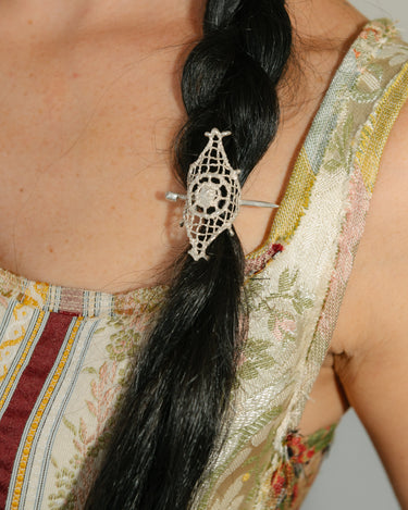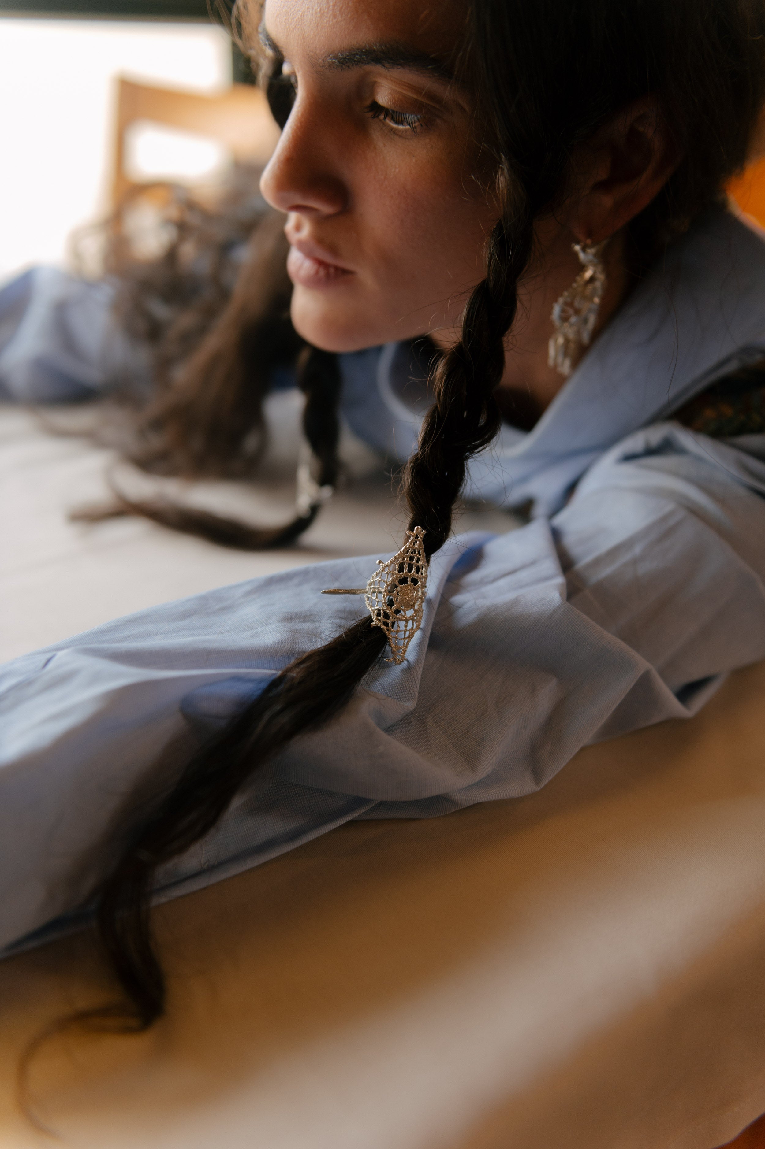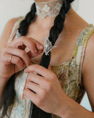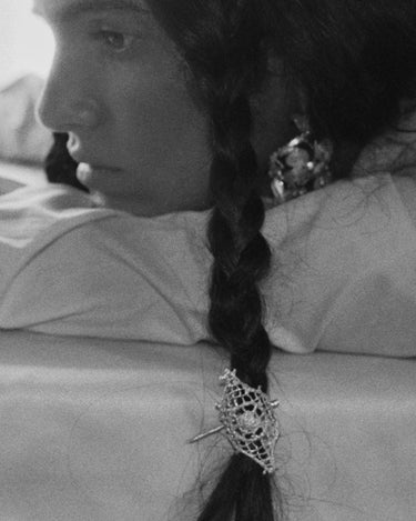 At the end of the braid, a silver chirimolla seals the hair like a talisman. The rhombus, a magical figure, concentrates within it the power of the secret and the ancestral.