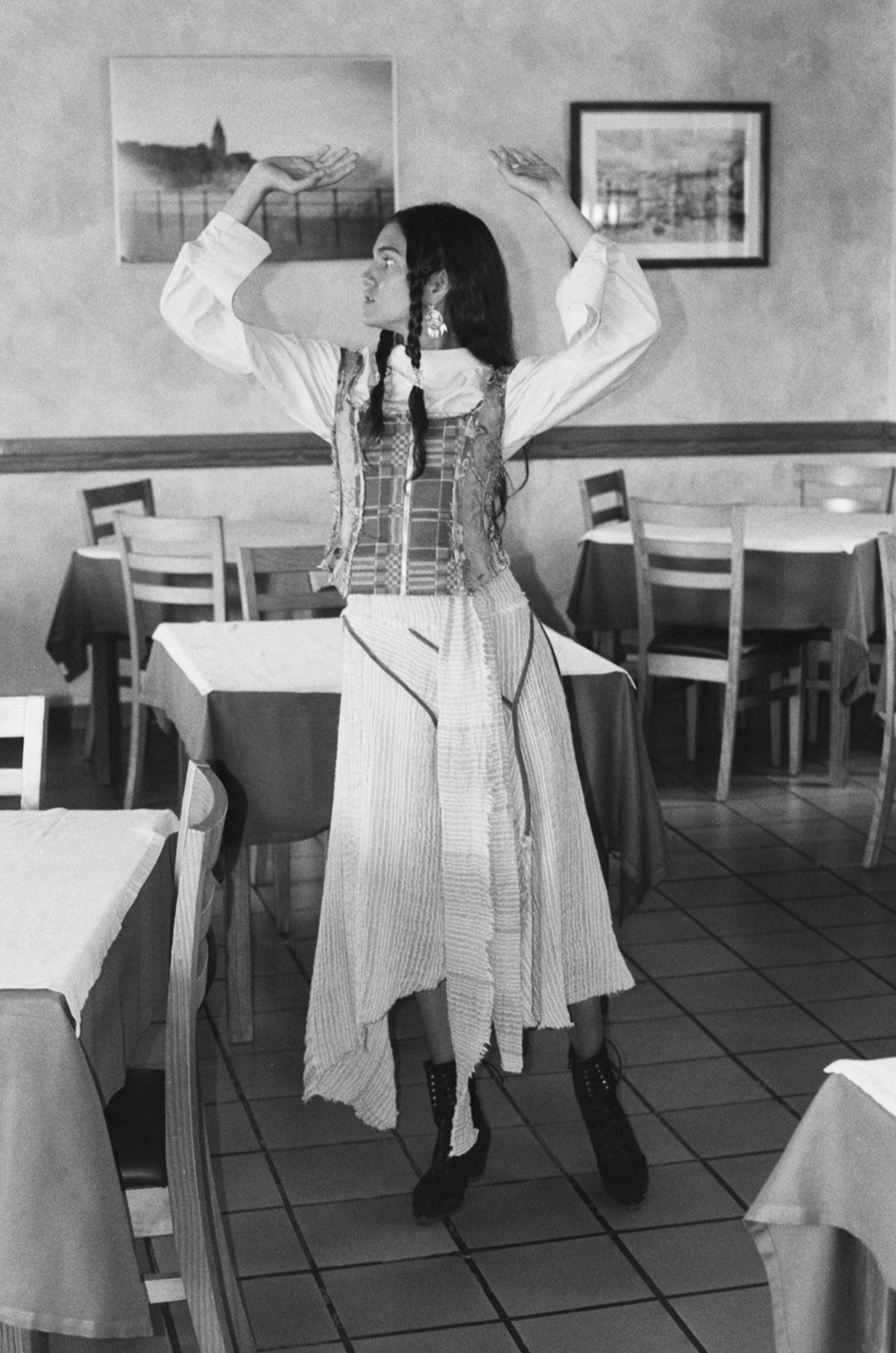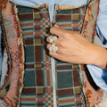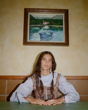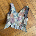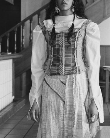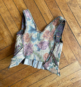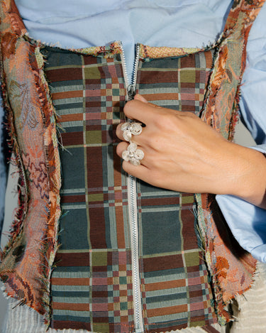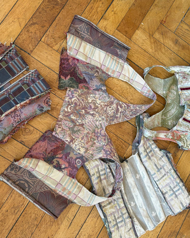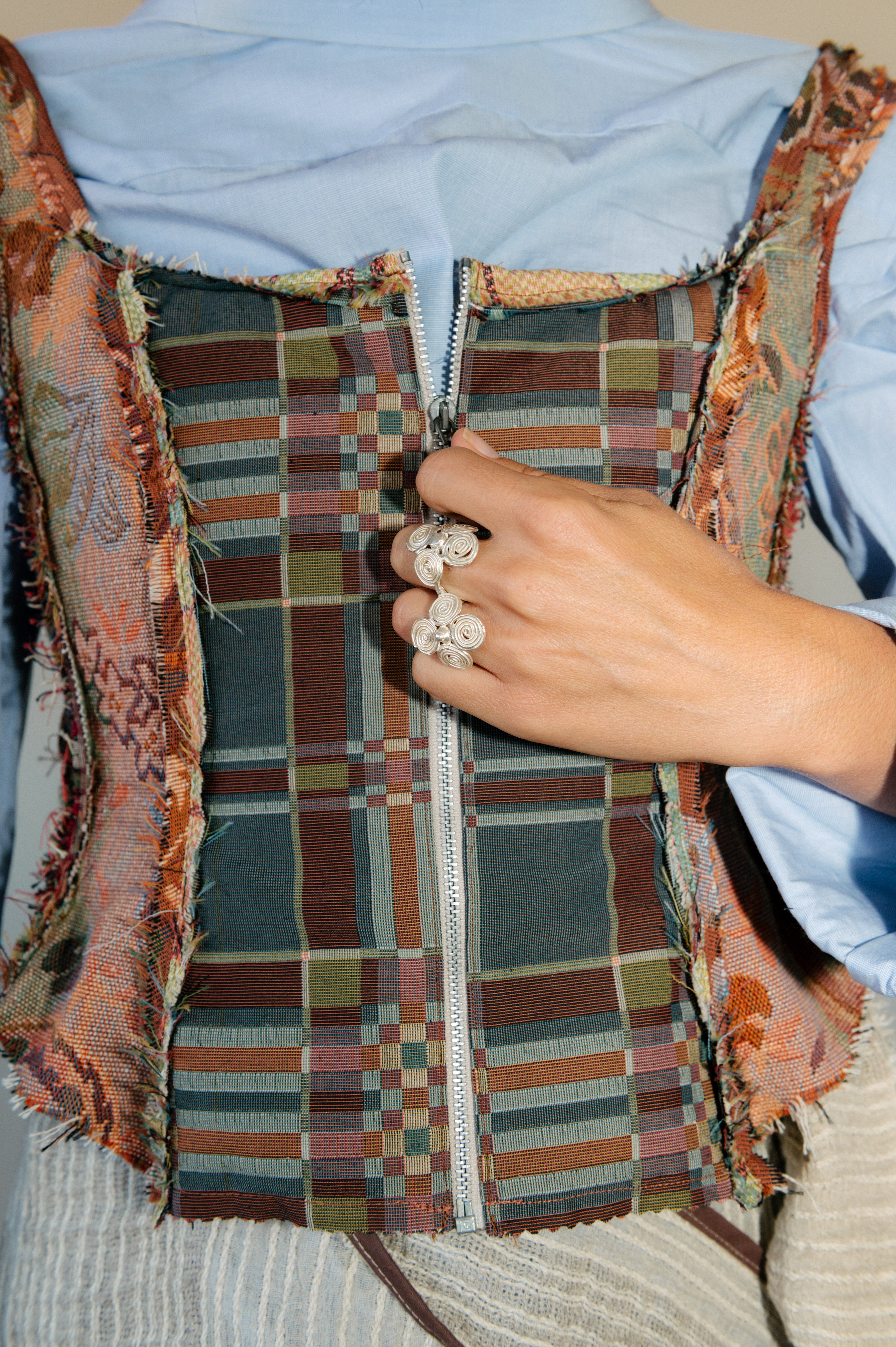 A vest crafted from vintage upholstery remnants, inspired by traditional Asturian vests. It closes with a front zipper and is designed to be as versatile as it is unique: perfect to layer over other garments or to wear directly on the skin as a top.