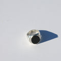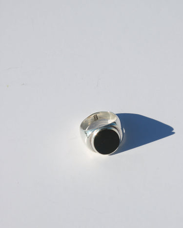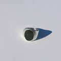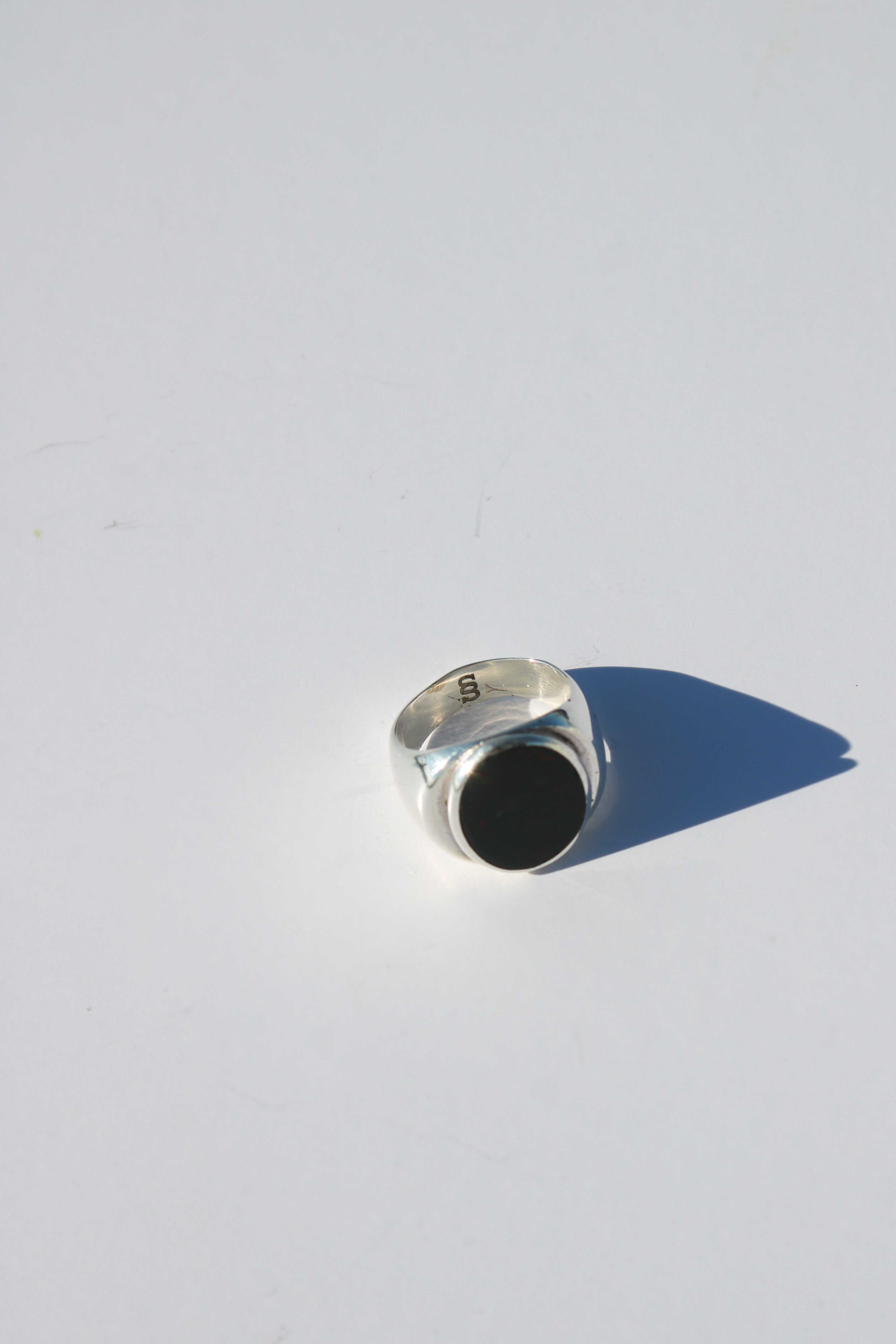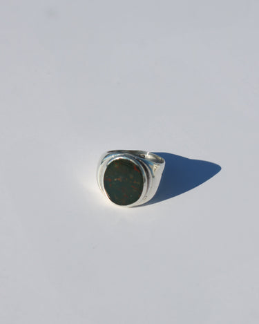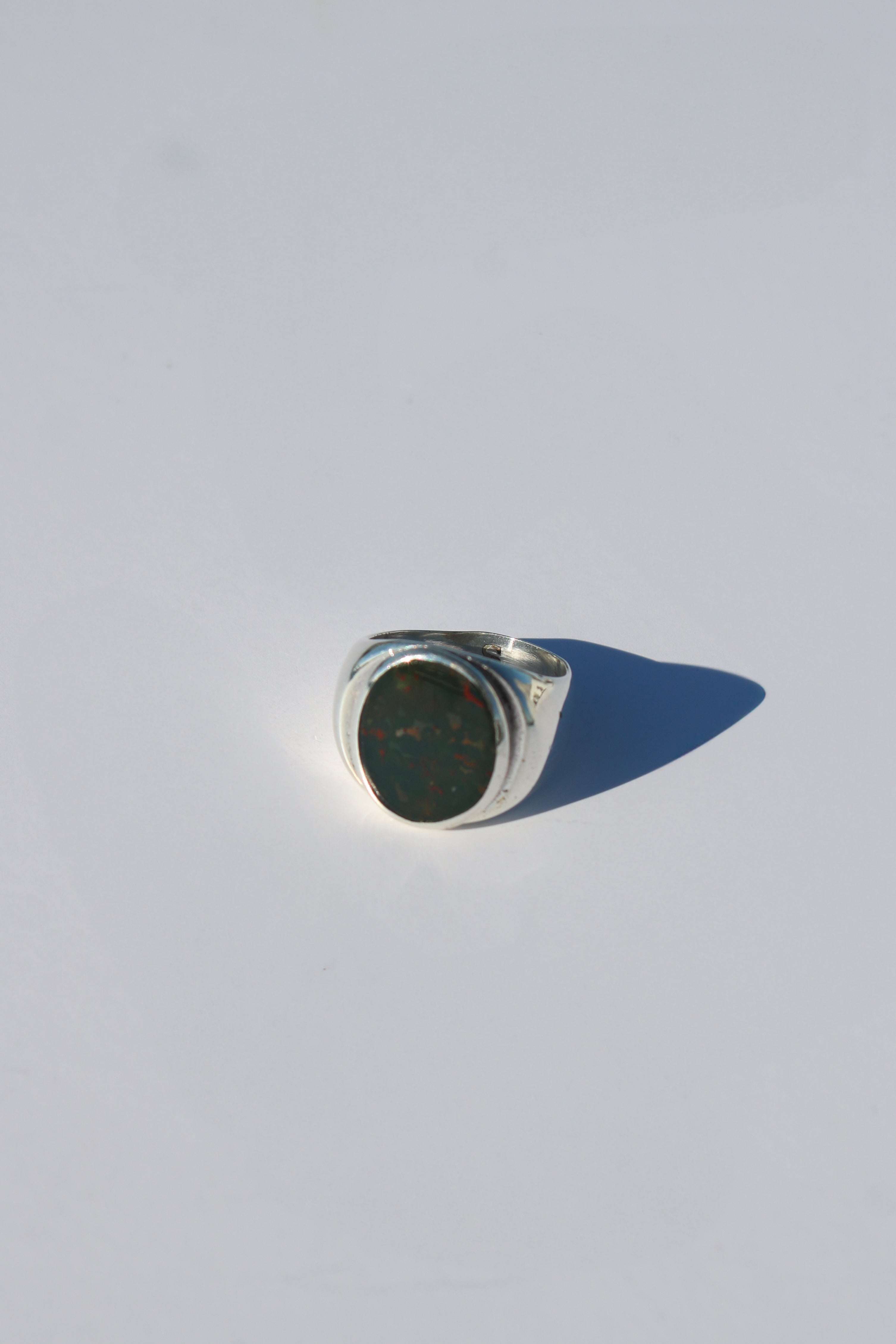 Heliotrope is associated with the root chakra, which is believed to provide a sense of security and stability. This ring is part of our Arcane Collection, and the design varies in stones. Heliotrope seems almost black at first glance, but in sunlight, its deep green tones and red specks come to life. All stones vary because of their natural course.