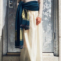 Please note: This is a completely handmade garment, and due to the traditional handmade processes of dyeing, weaving, washing, stretching, and prepping, the shawl may display natural imperfections.