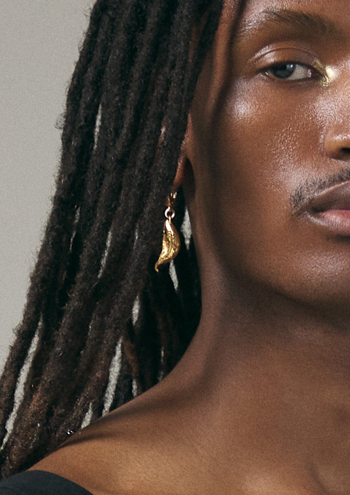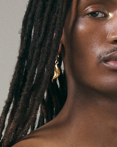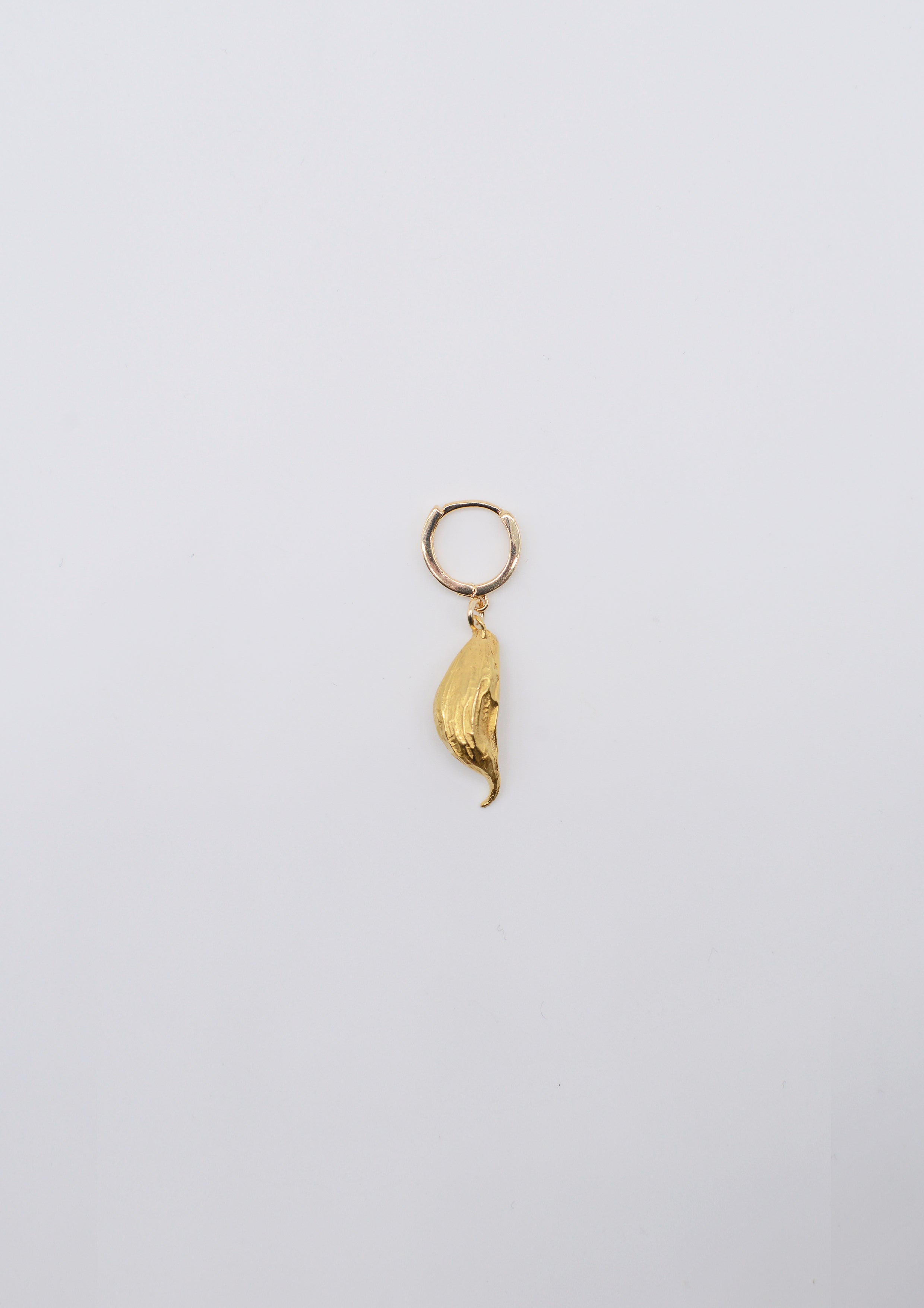 18 karat gold plated brass garlic, paired with a 18 karat gold plated brass hoop earring and 12 karat gold jump ring.
