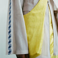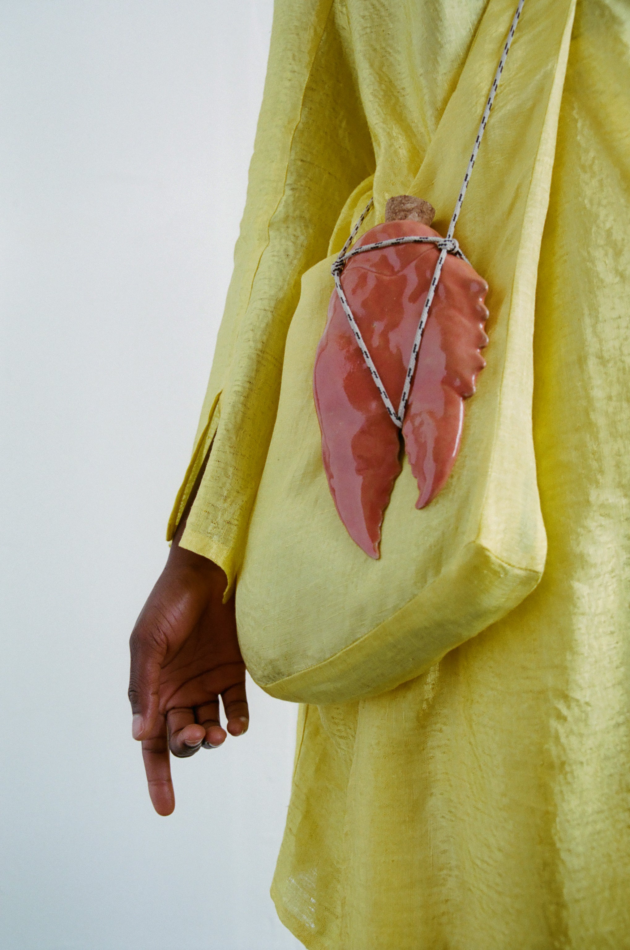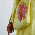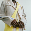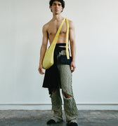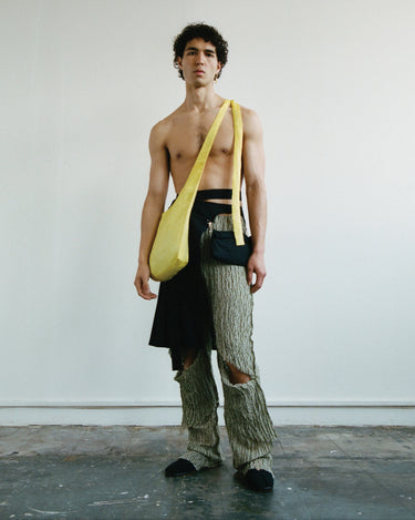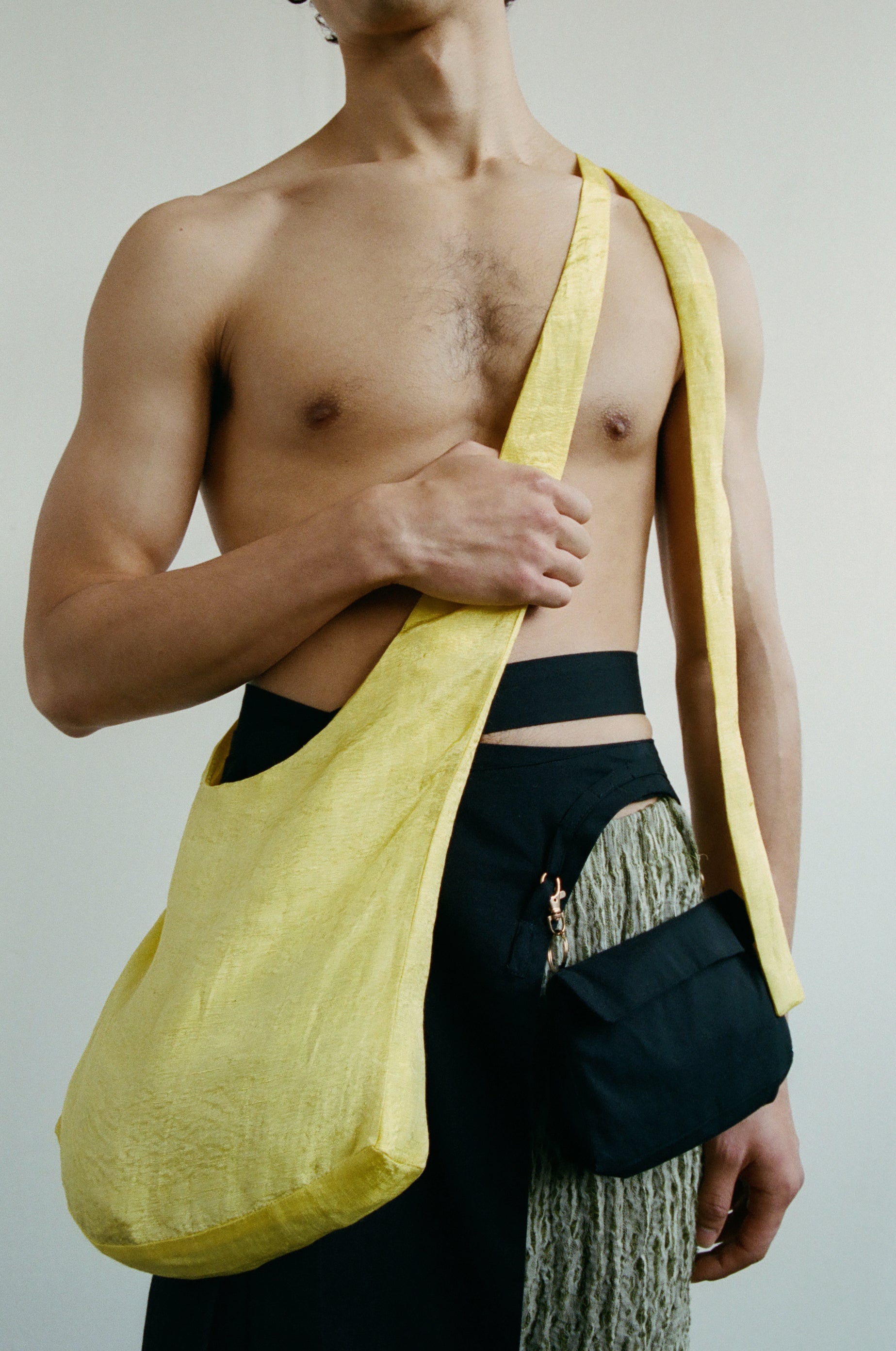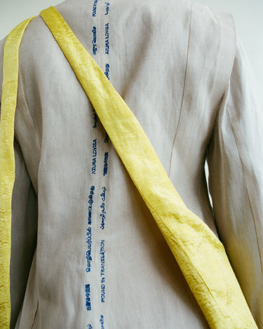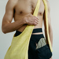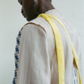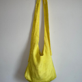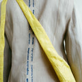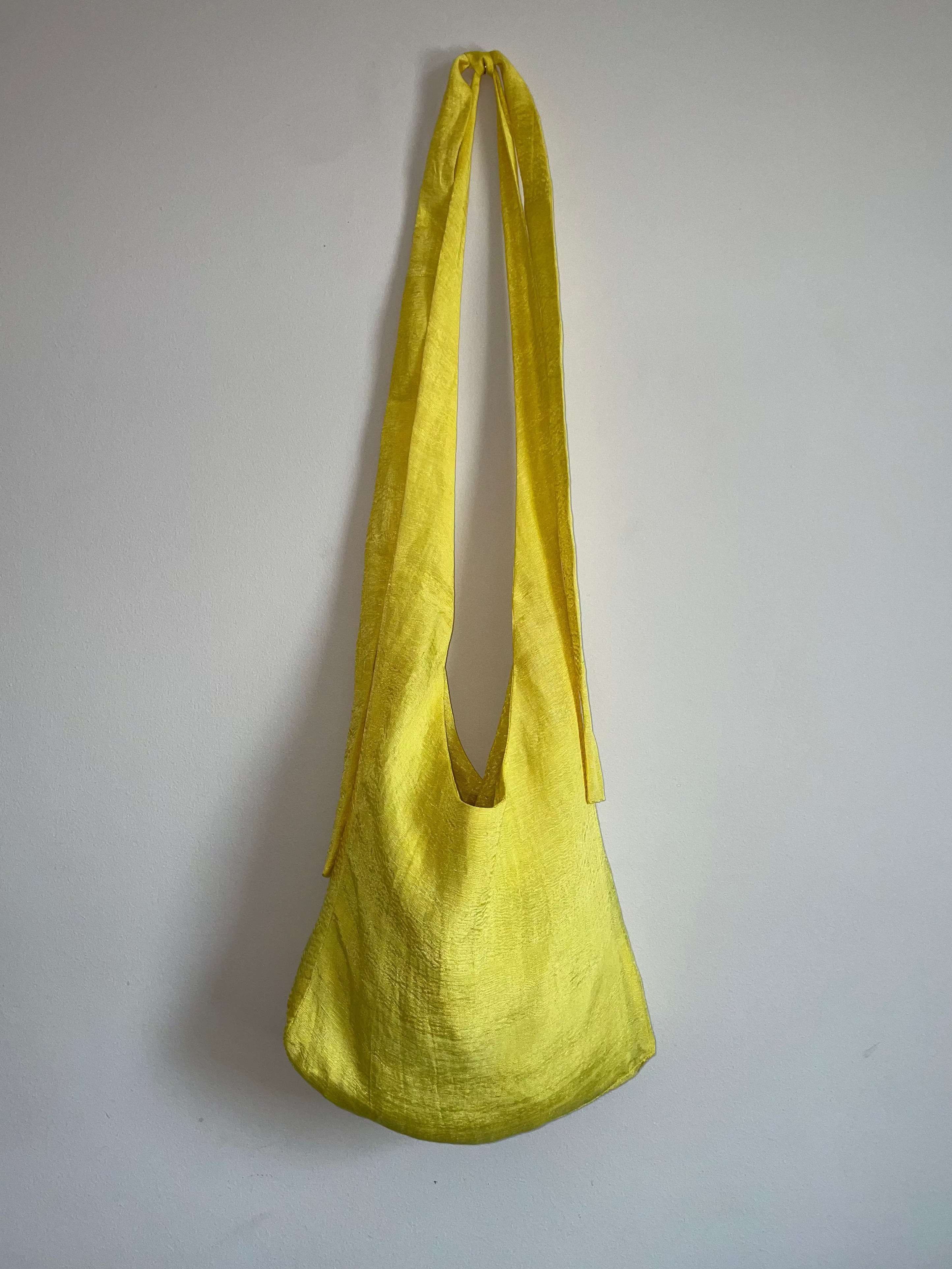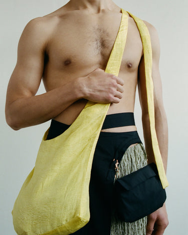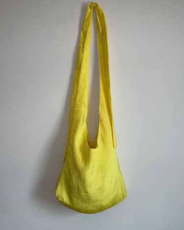 APPLICATION:Multiway sling bag in silky sulphur yellow bamboo-linen fabric with extra long tie straps that can be tied to be worn over shoulder, around waist, or as a backpack