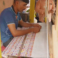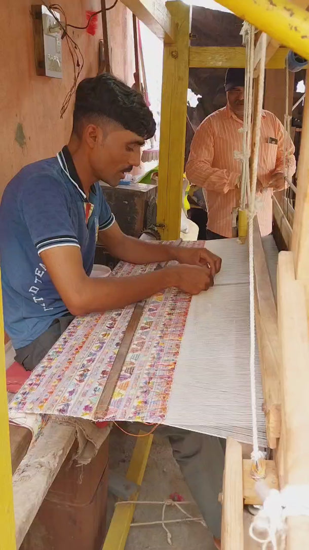 Lakhabhai Valabhai is a master weaver from Jam Khambhaliya, Gujarat. With 32 years of weaving experience, he has dedicated his life to preserving the ancestral weaving rituals of his village and documenting communal memory through textiles. He's currently training 5-6 weavers to continue preserving the craft.
