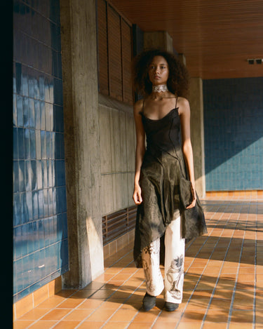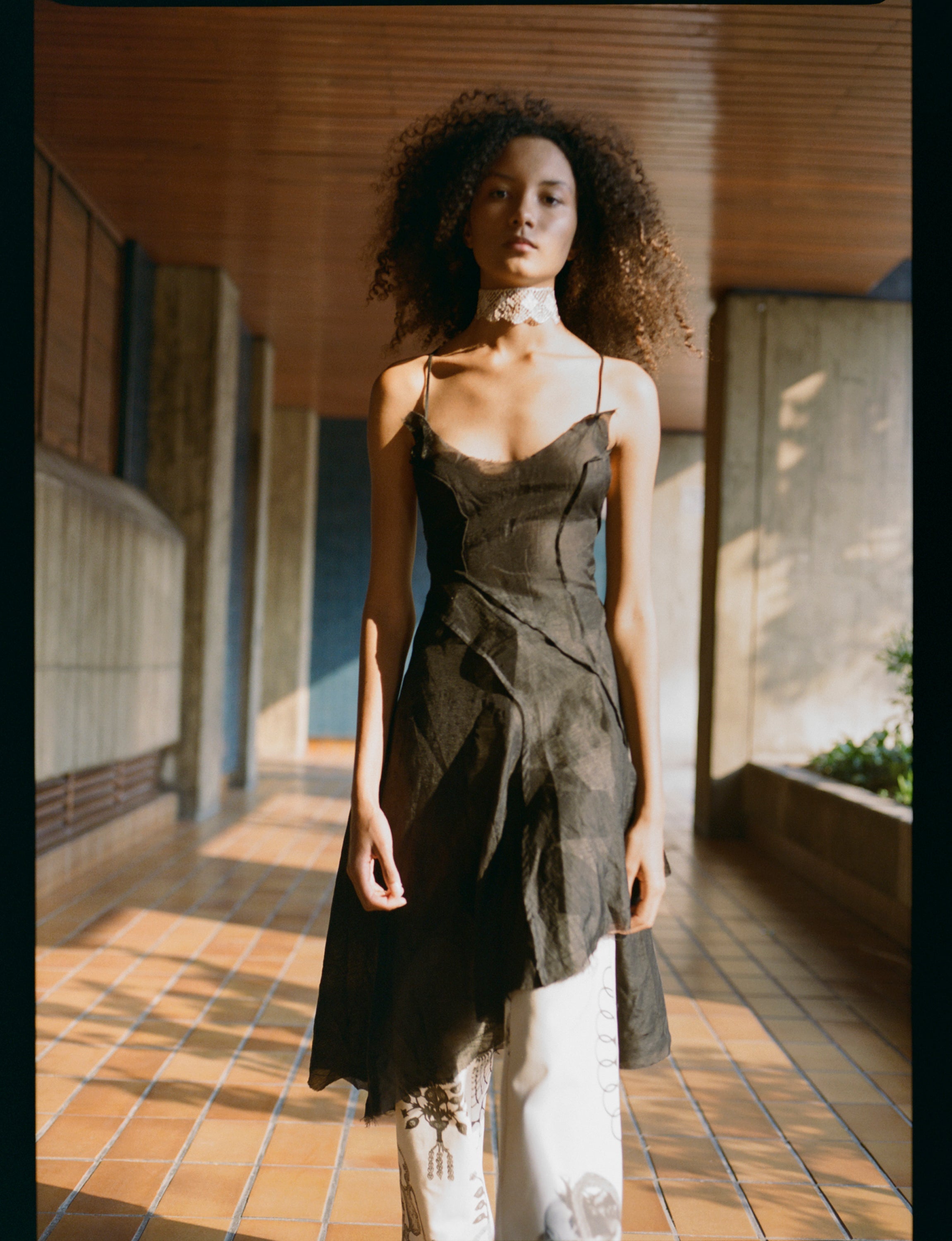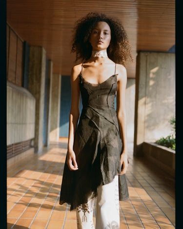 The piece is crafted using patchwork, a process that allows us to make the most of the fabric and minimize waste. For this dress, we chose high-quality mix of silk and linen, a material with a subtle sheen that brings lightness and sophistication.