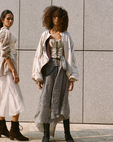 Another intention of this project is to explore how to blend different sustainable fabrics such as silk with linen, recycled bamboo, recycled nylon and upcycled antique curtains.