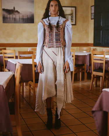 An asymmetric skirt with a flowing silhouette, designed to be both versatile and comfortable. Its wrap-around style makes it easy to adapt to every body type, bringing elegance and freedom of movement.