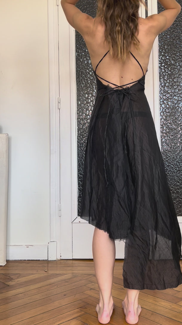 The piece is crafted using patchwork, a process that allows us to make the most of the fabric and minimize waste. For this dress, we chose high-quality mix of silk and linen, a material with a subtle sheen that brings lightness and sophistication.
