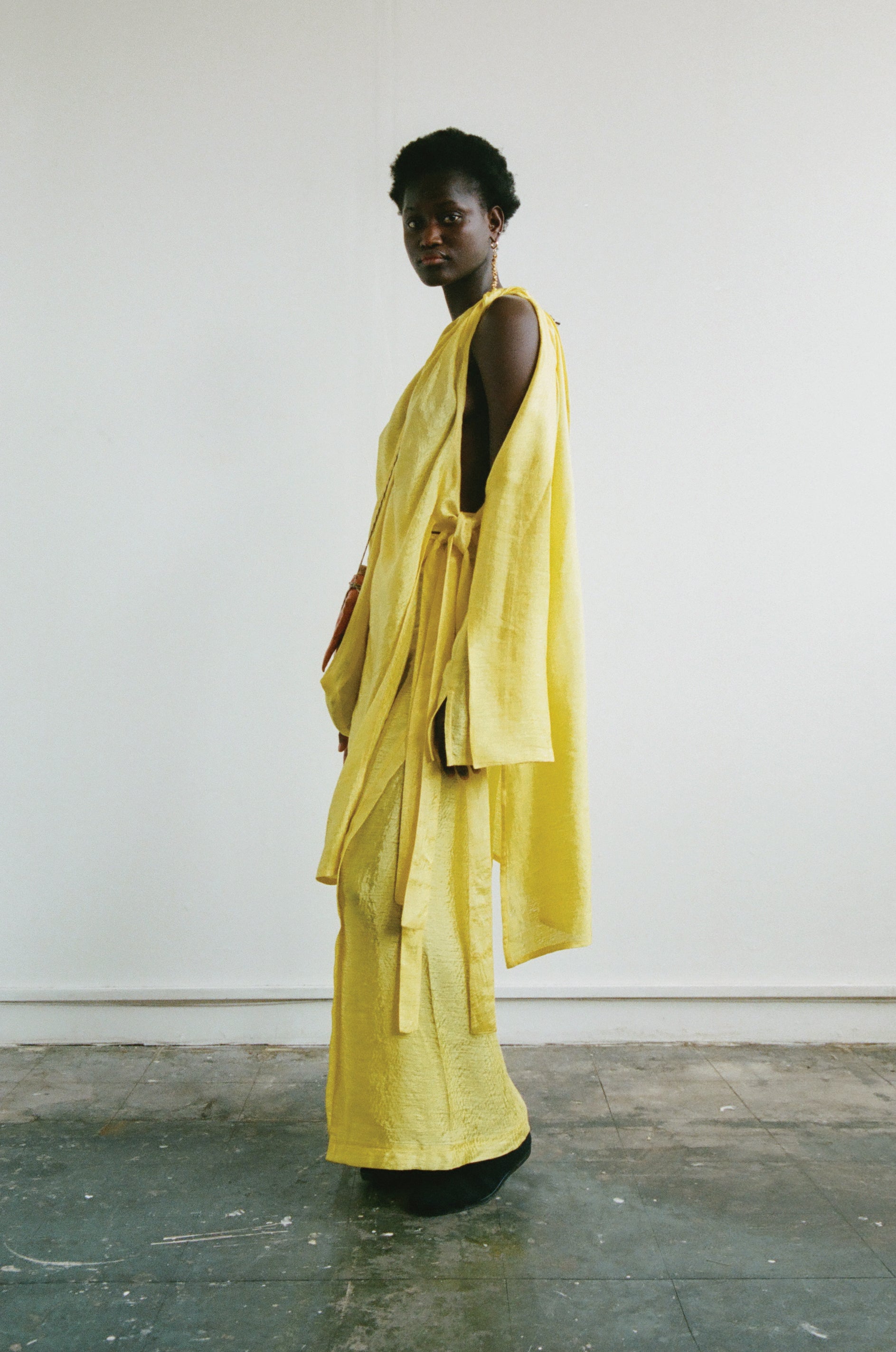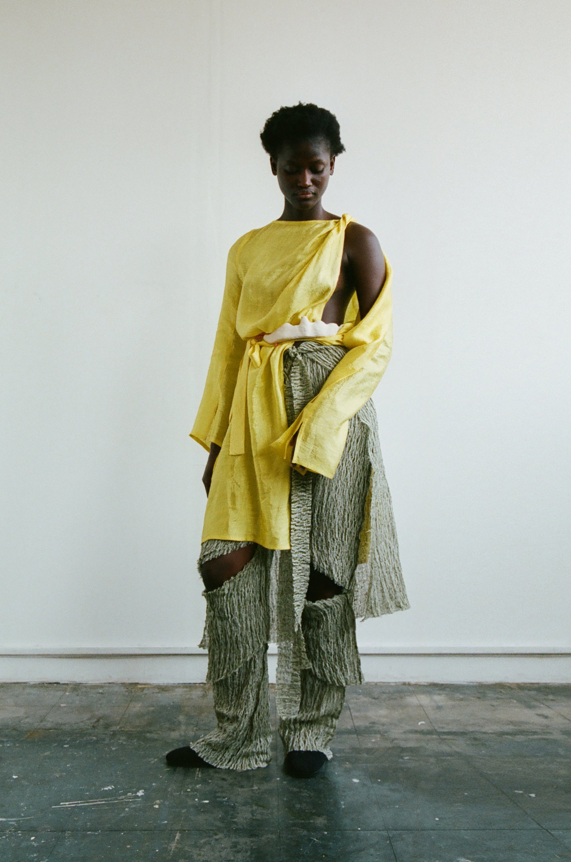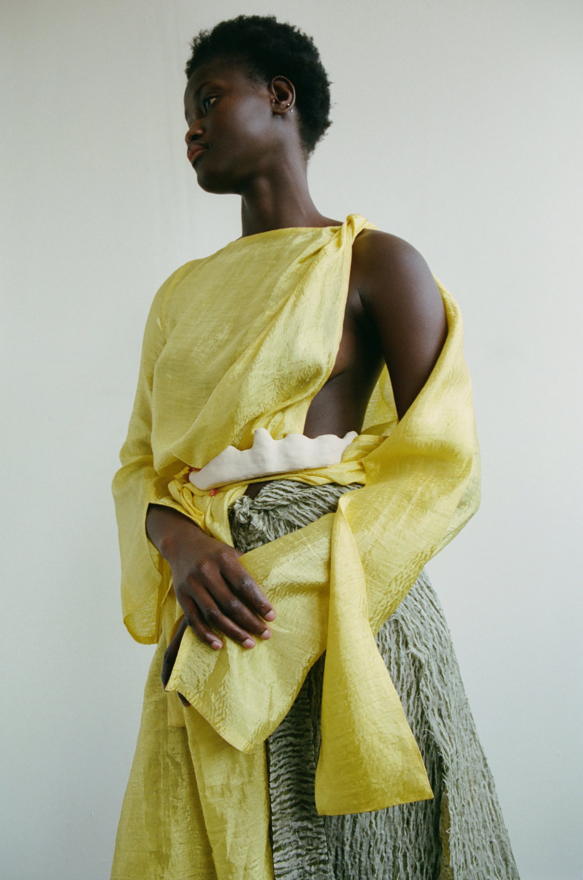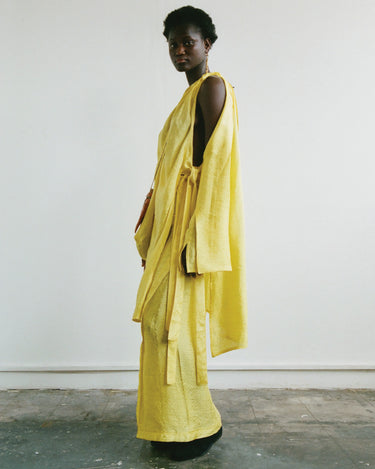 Crafting contemporary genderless mythwear, her practices are committed to sustainability and honoring traditional crafts - all garments are handwoven with natural fabrics where the marks of the maker are evident.