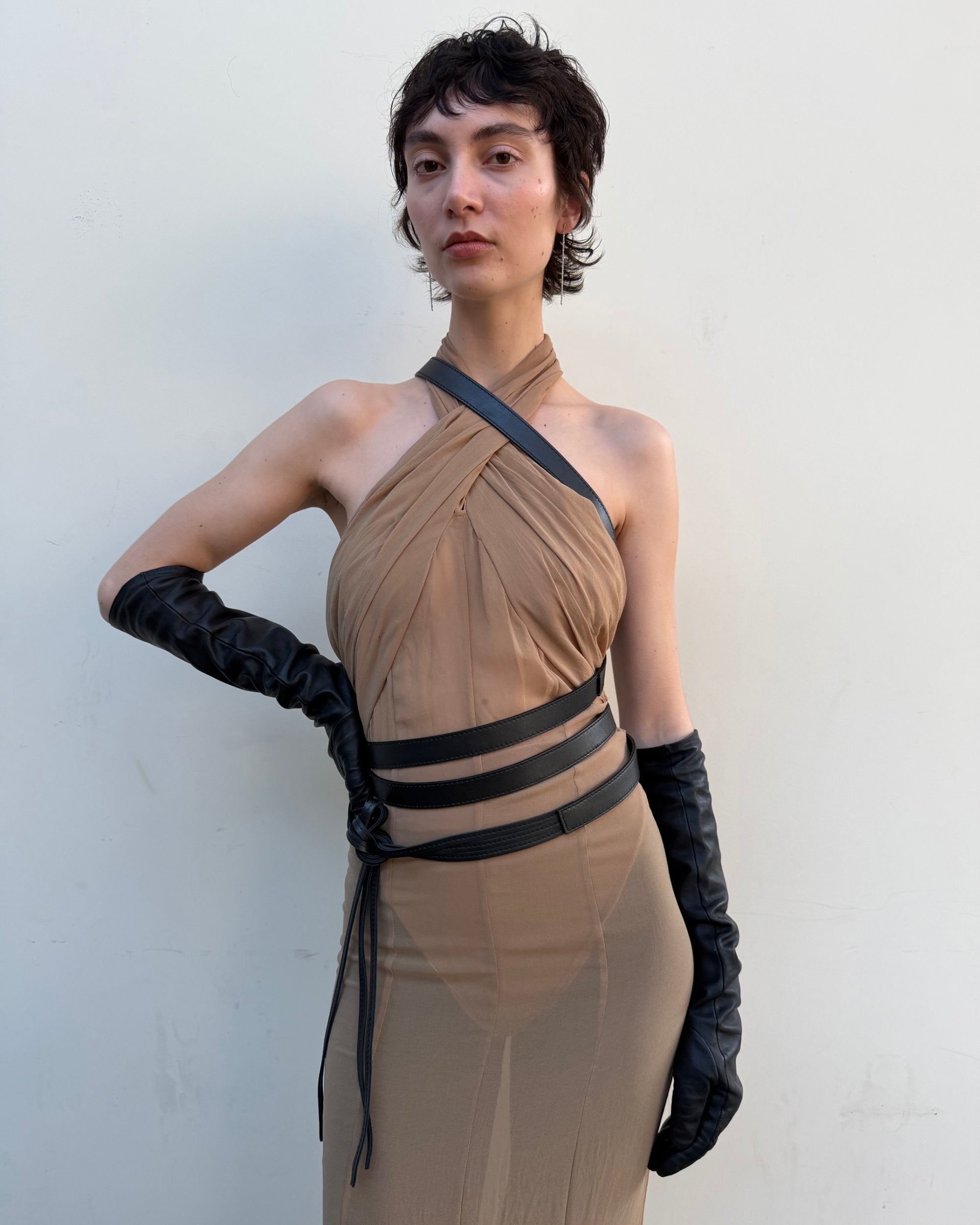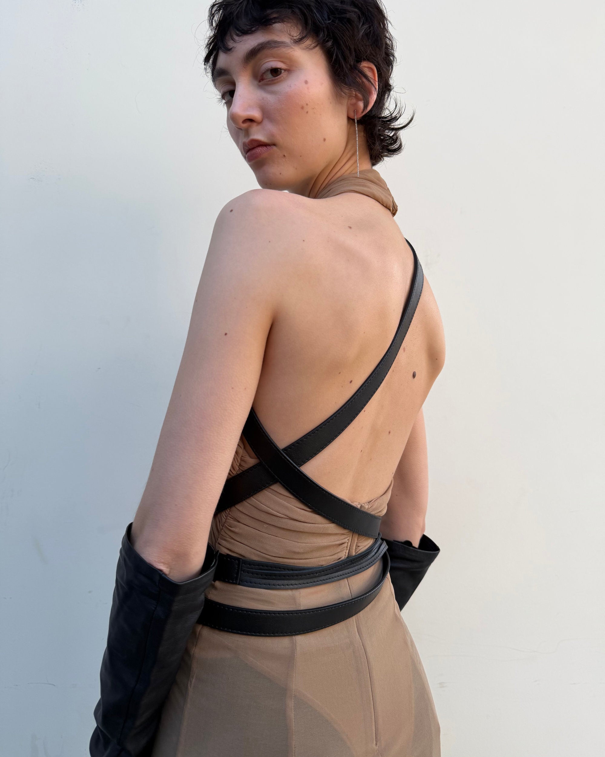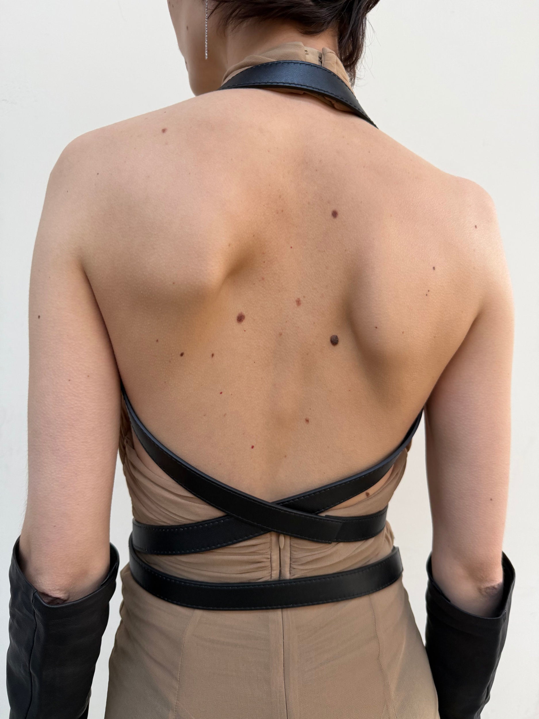 Wear it casually over a cotton shirt for a polished daytime look or pair it with a sleek slip dress to elevate your evening fit. Made from soft black leather, this versatile harness belt combines elegance and minimalism. A must-have piece that will save and change your outfit in countless ways.