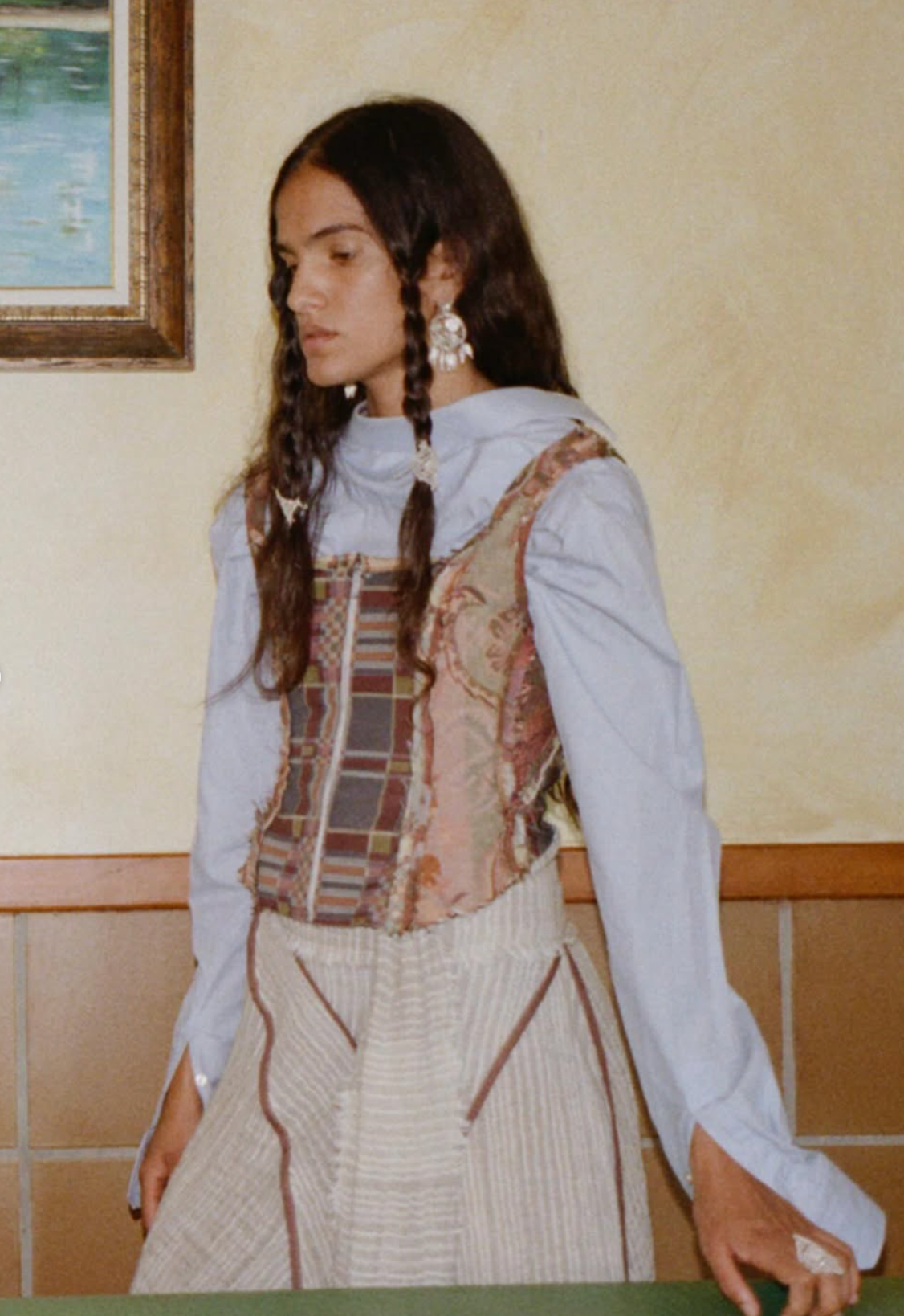 A vest crafted from vintage upholstery remnants, inspired by traditional Asturian vests. It closes with a front zipper and is designed to be as versatile as it is unique: perfect to layer over other garments or to wear directly on the skin as a top.