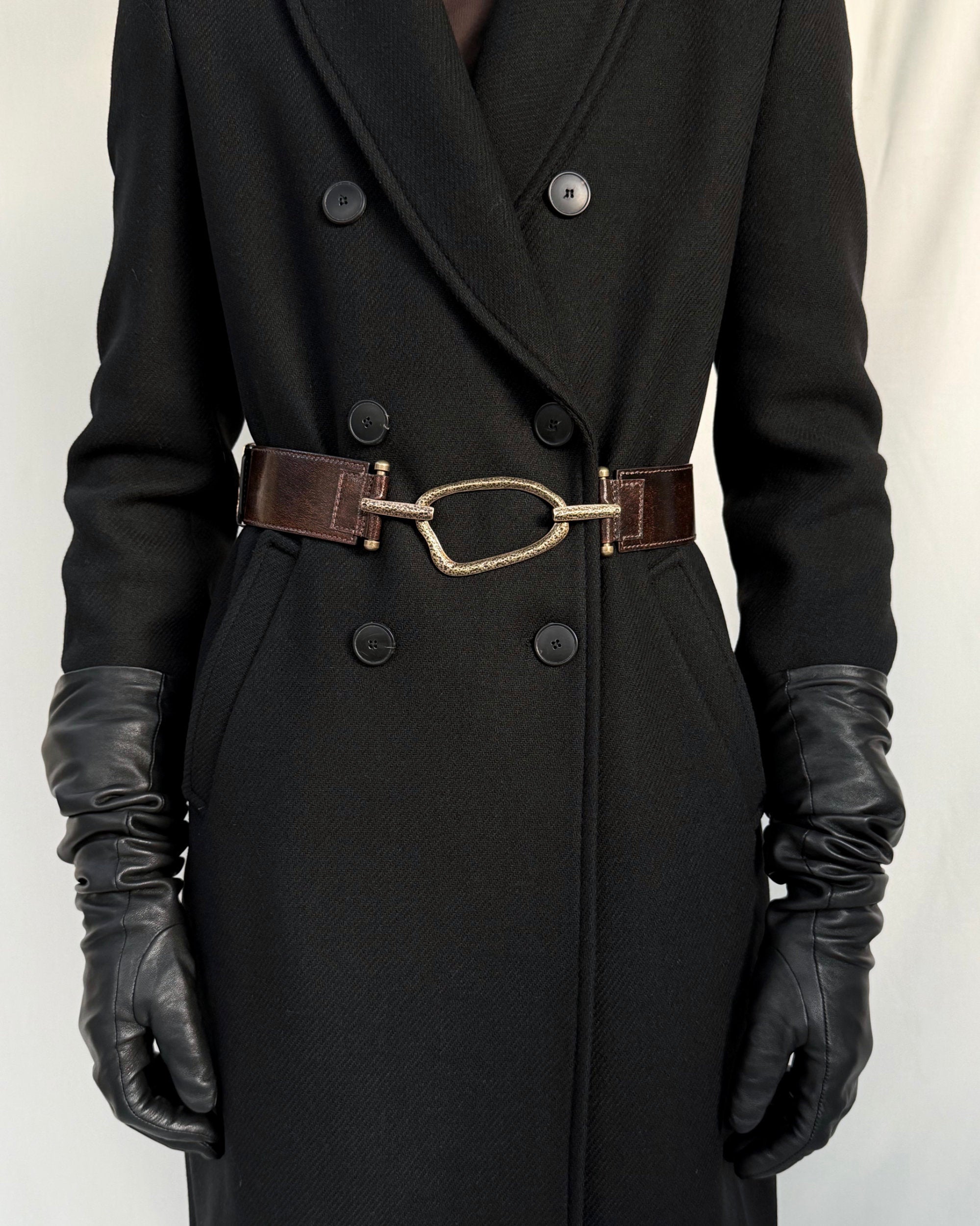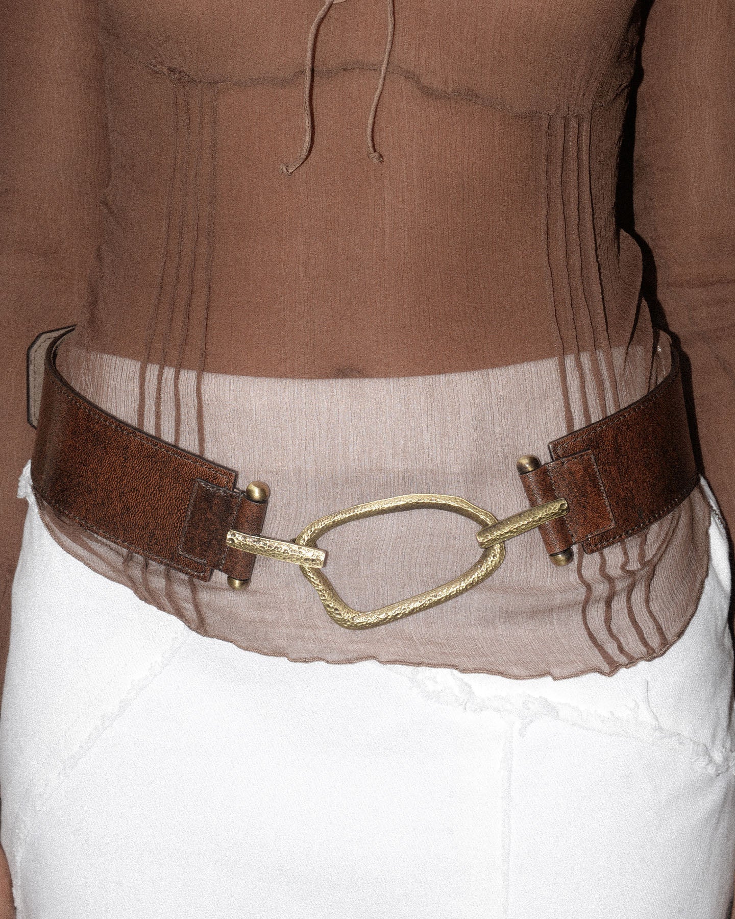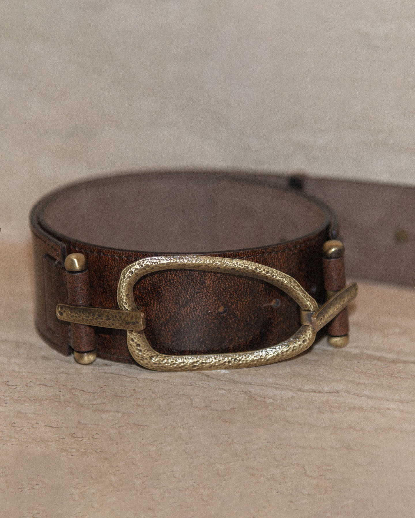Handcrafted in Naples, Italy, this brown belt features rich, textured leather with a natural grain that gives it depth and character. The statement bronze metal hammered buckle adds a bold touch that stands out without overpowering the design.