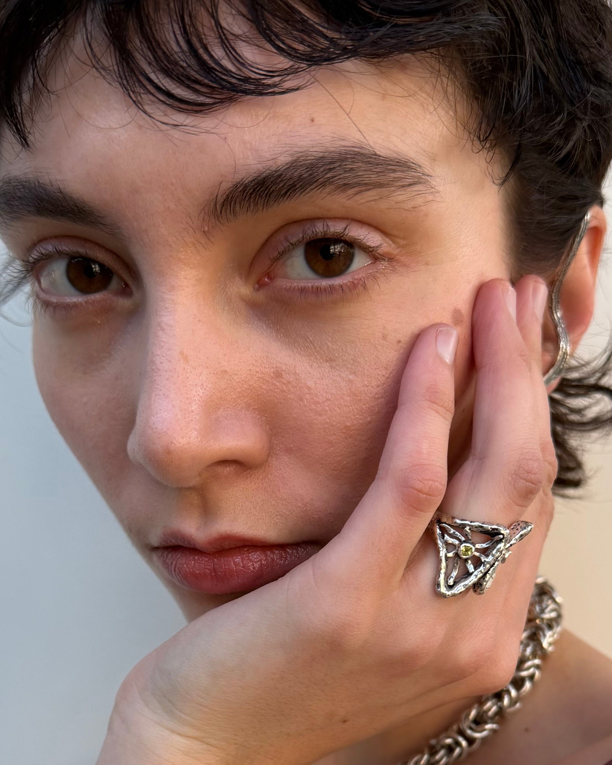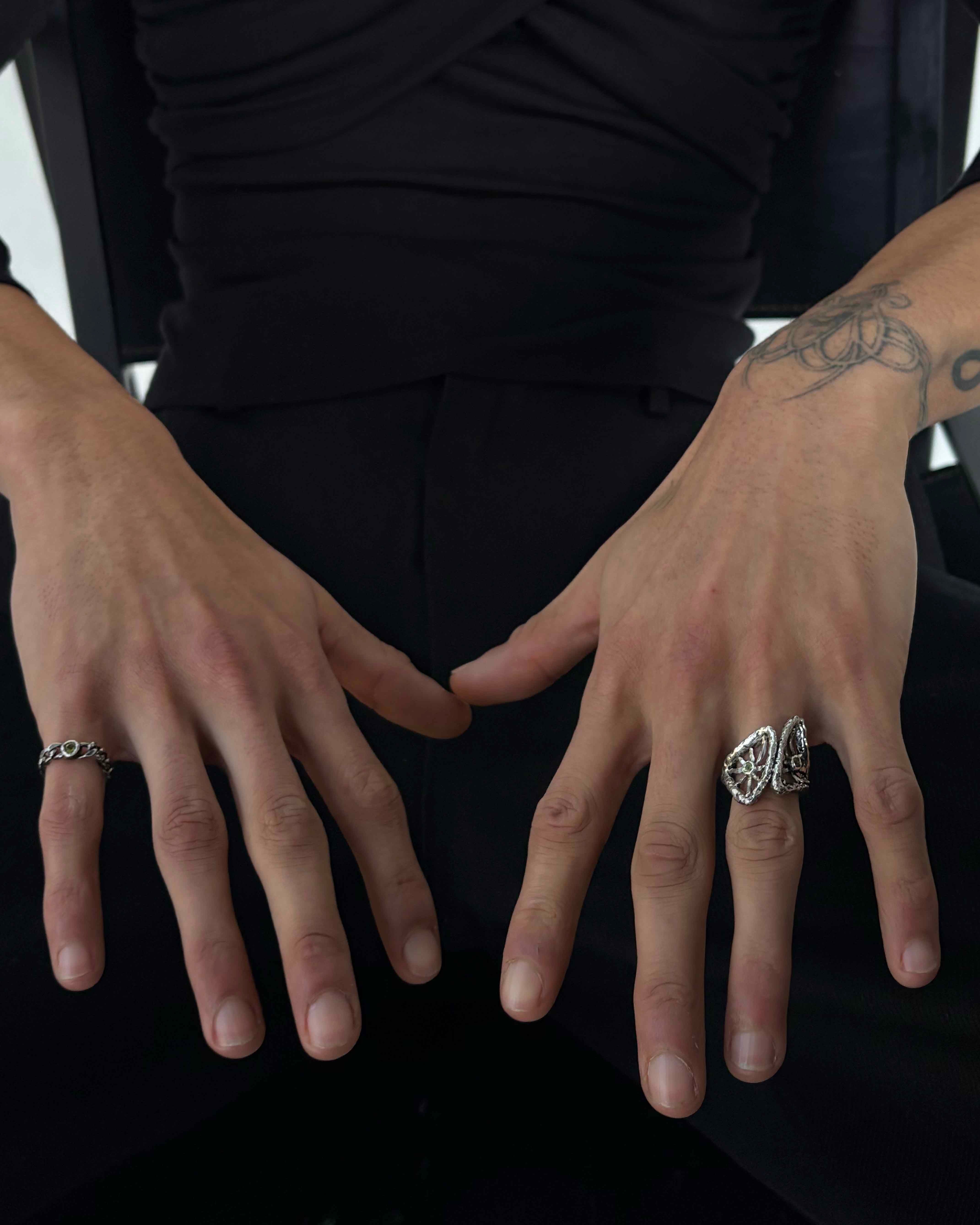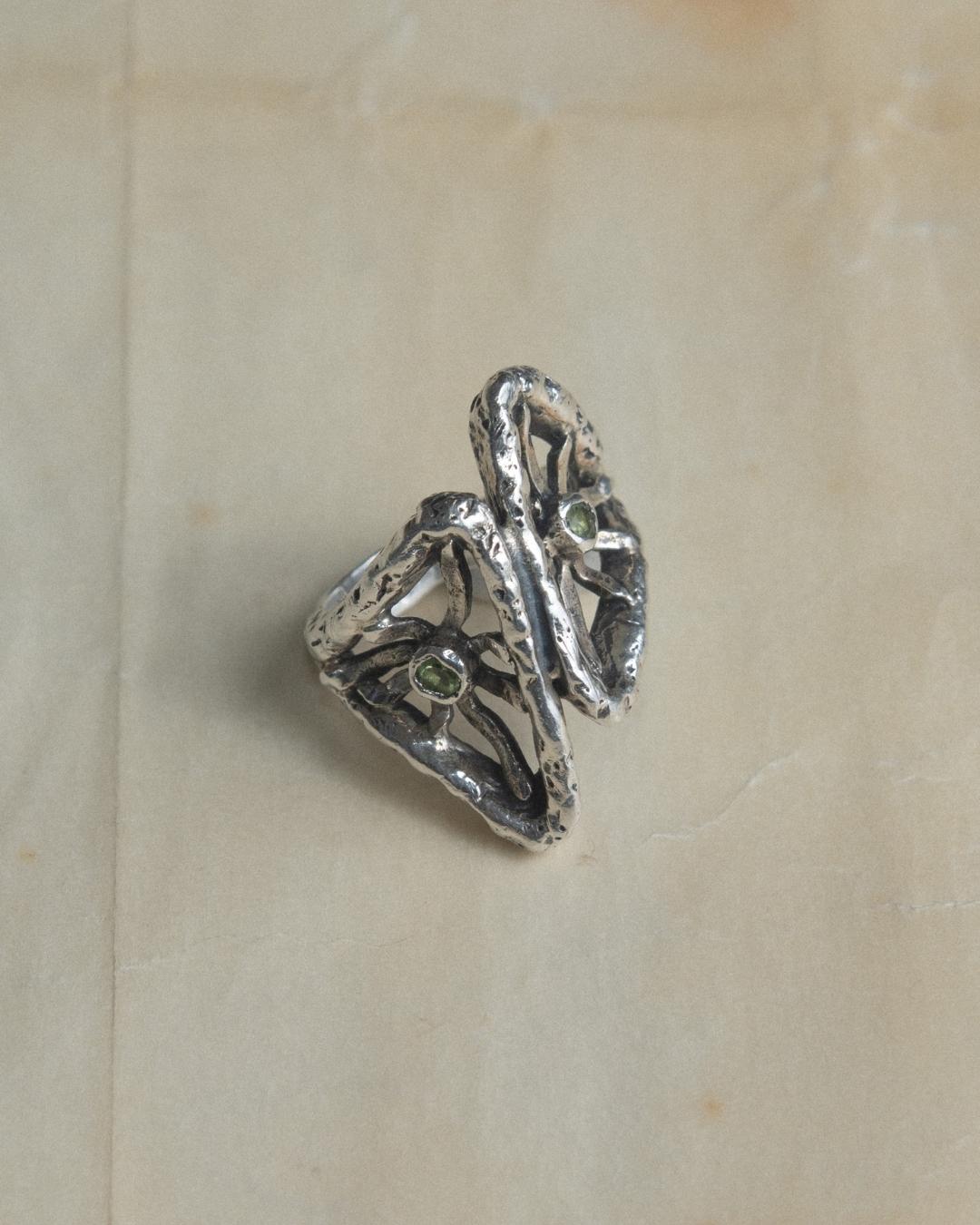 Inspired by my grandmother’s cherished ring, this piece pays homage to her memory, reimagined through a modern lens. At its center, natural stones are gently cradled by radiating metal rays, suggesting warmth, protection, and continuity. With its bold silhouette and intimate origins, this sculptural sun silver ring is a statement with a story, rooted in tradition and personal life.