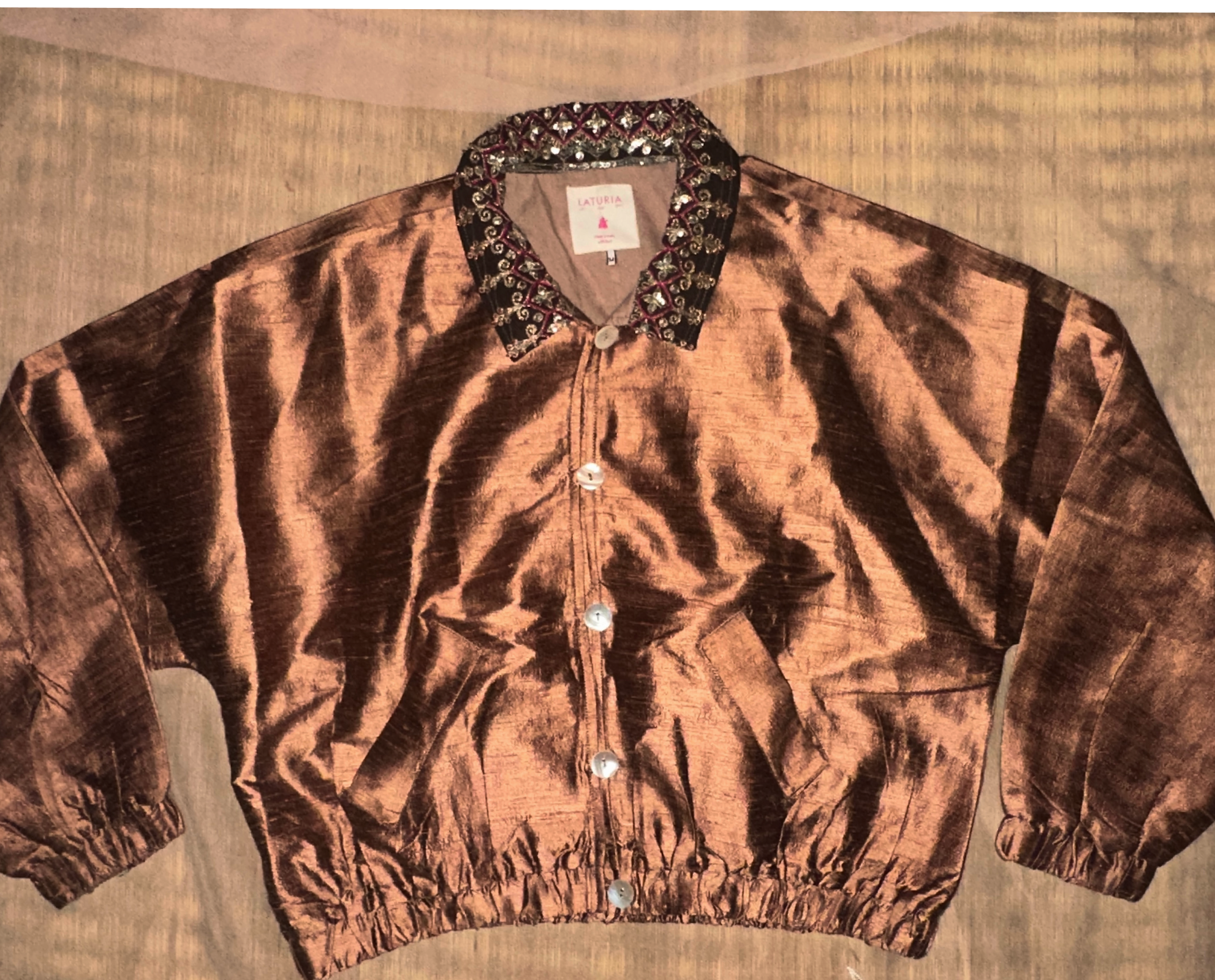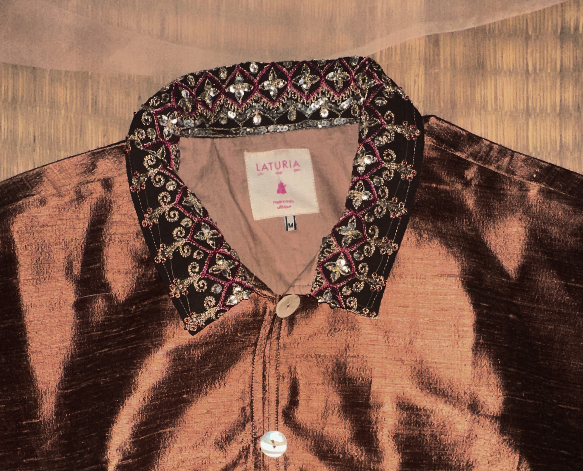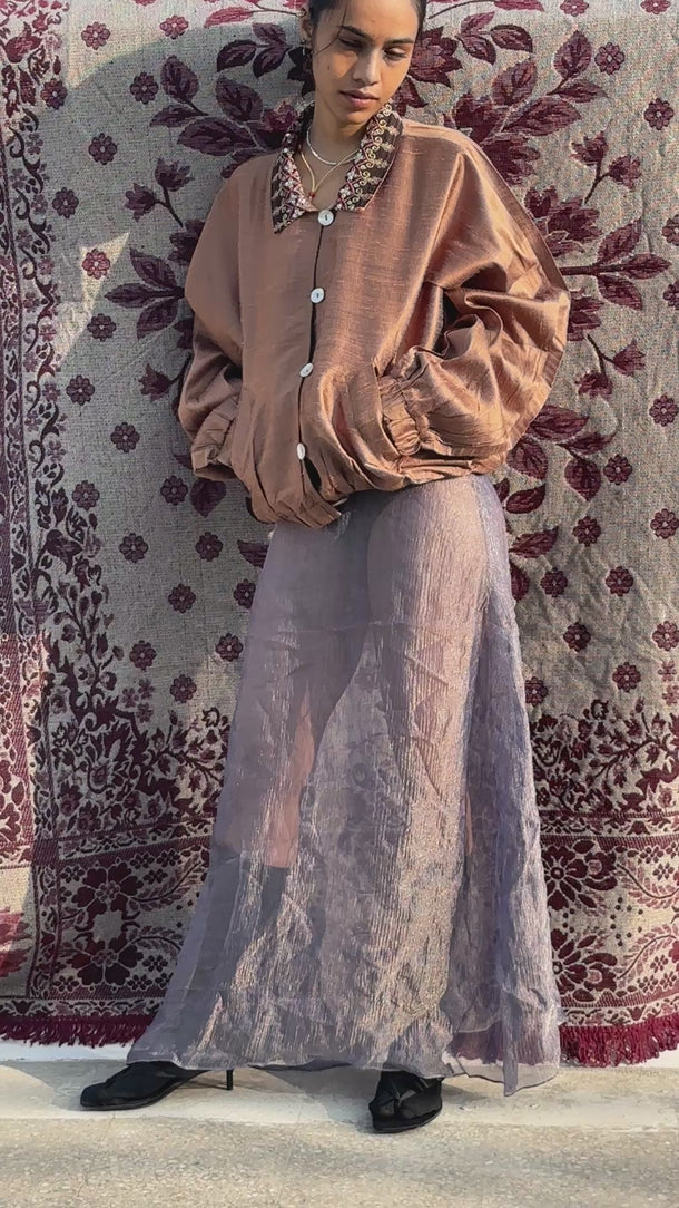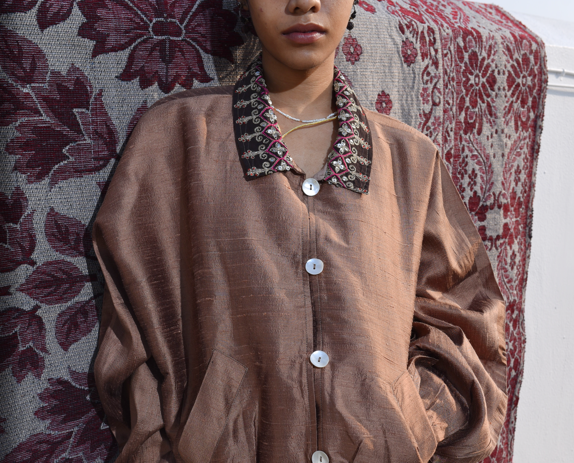 This jacket is crafted from handwoven raw silk, woven slowly on traditional looms to preserve the fabric’s natural irregularities and lustre. The collar is cut from a vintage hand-embroidered saree, upcycled from India’s textile archives — carrying traces of stories, ceremonies, and generations of craftsmanship.