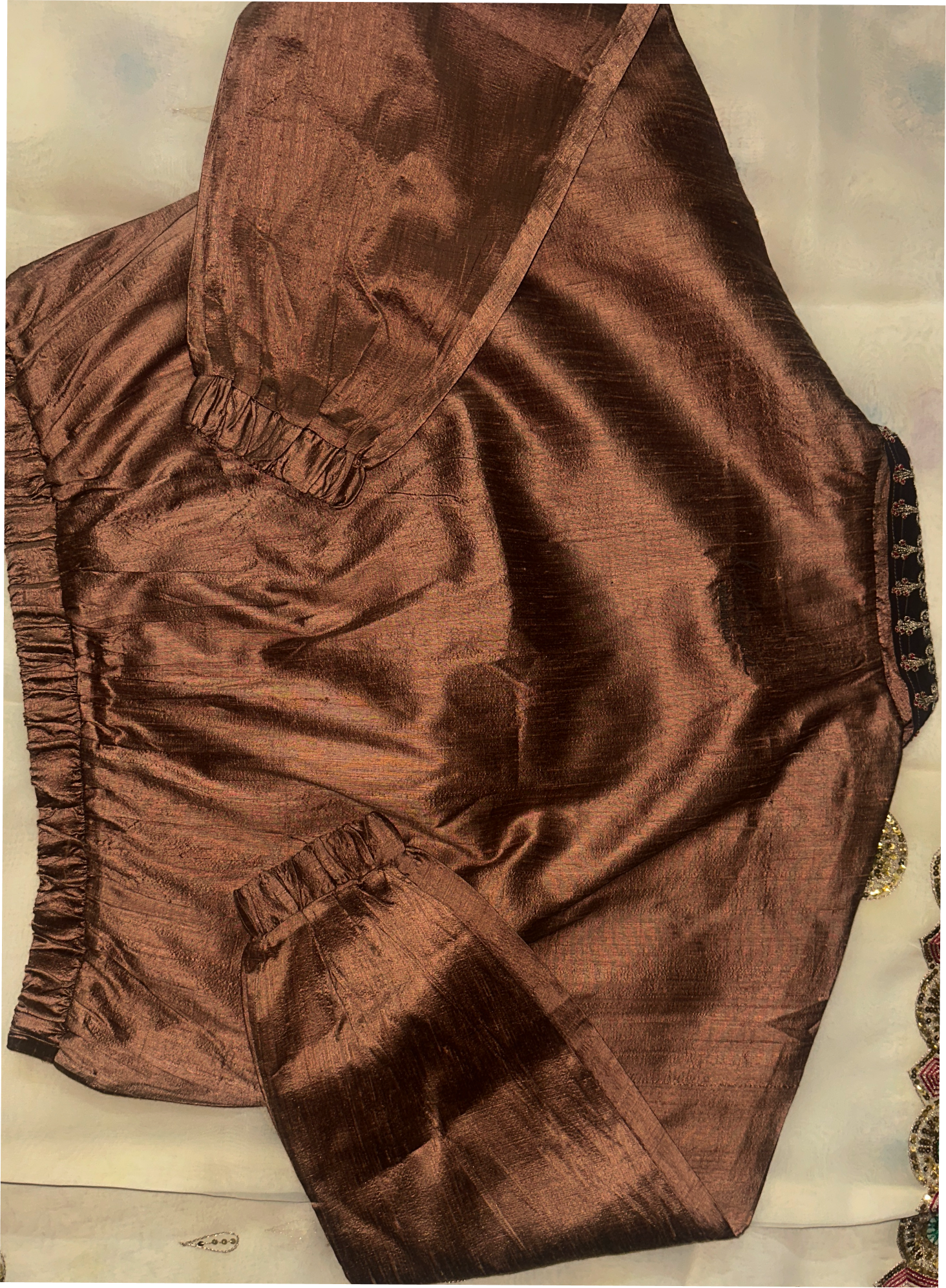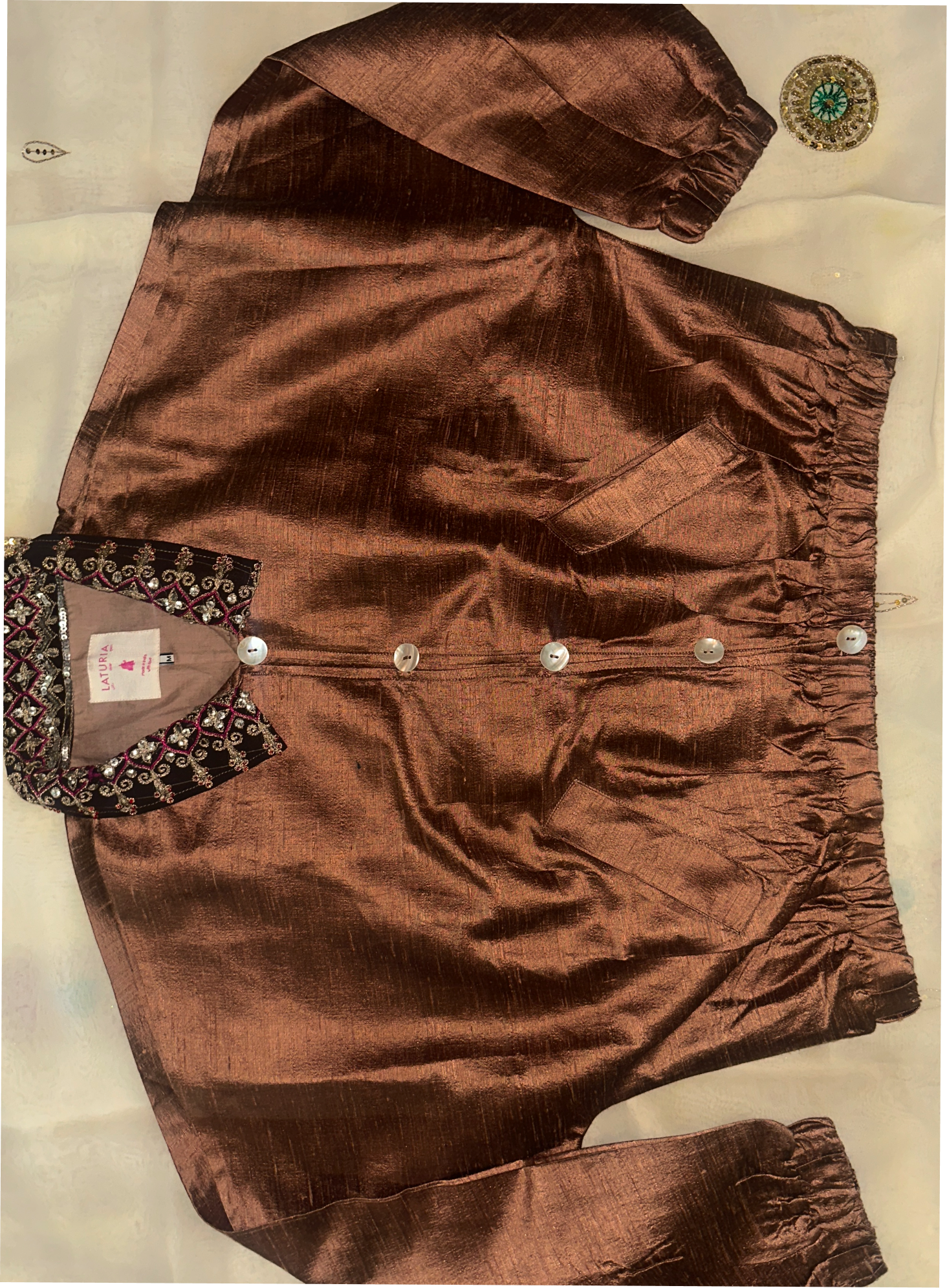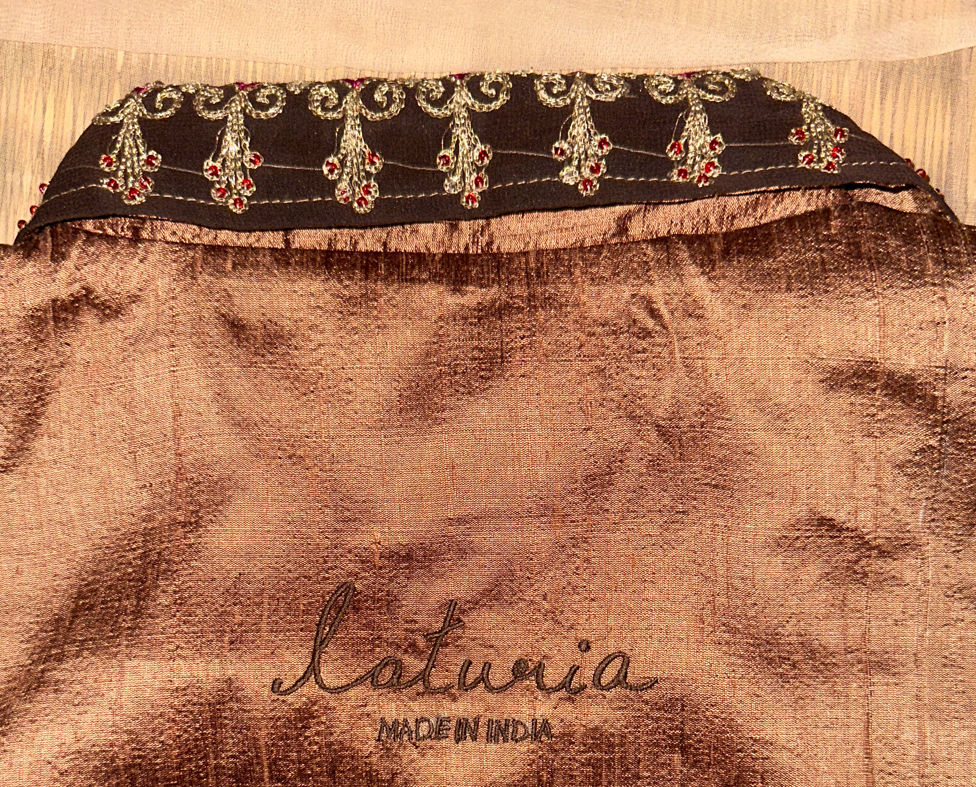 This jacket is crafted from handwoven raw silk, woven slowly on traditional looms to preserve the fabric’s natural irregularities and lustre. The collar is cut from a vintage hand-embroidered saree, upcycled from India’s textile archives — carrying traces of stories, ceremonies, and generations of craftsmanship.