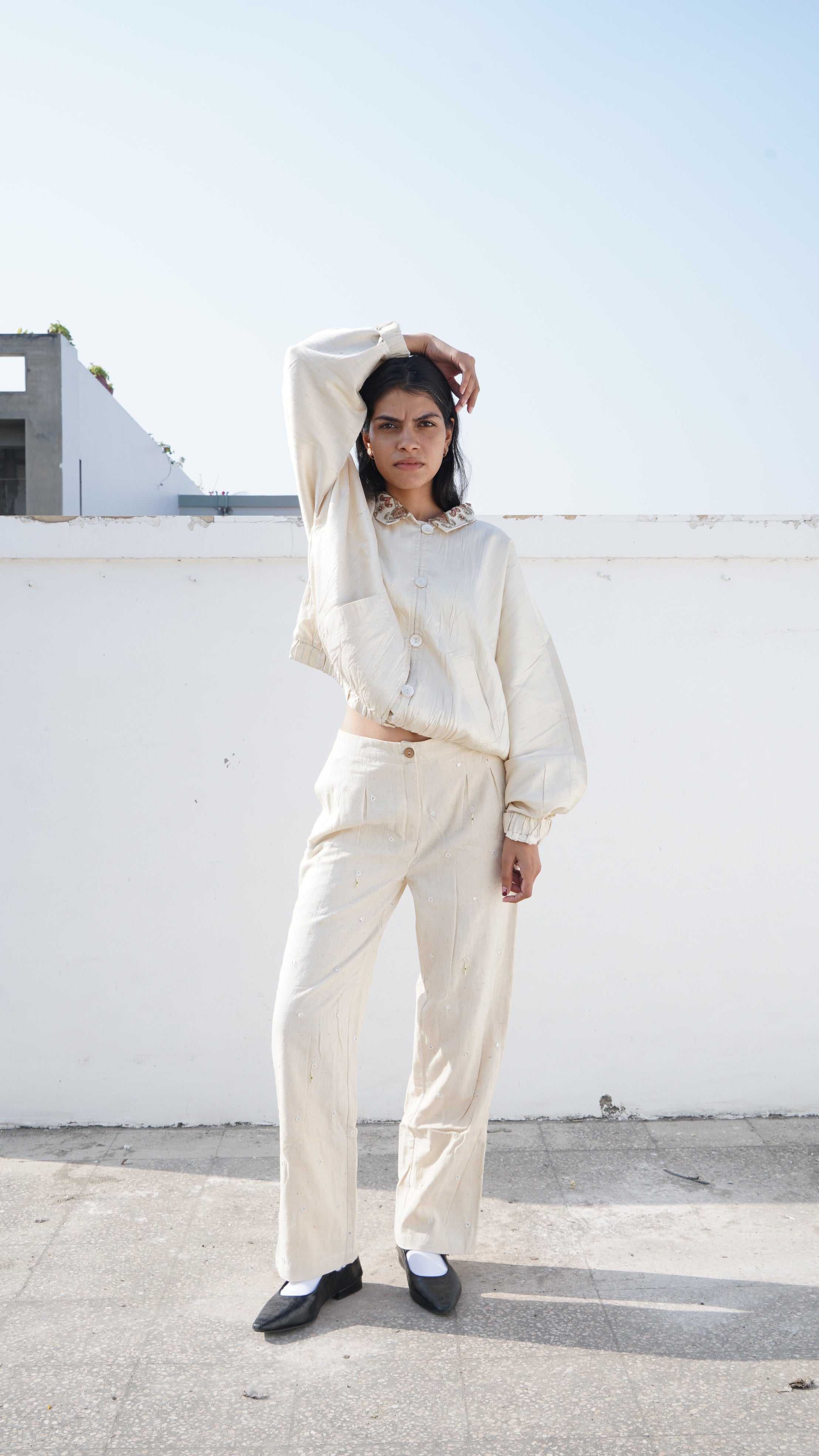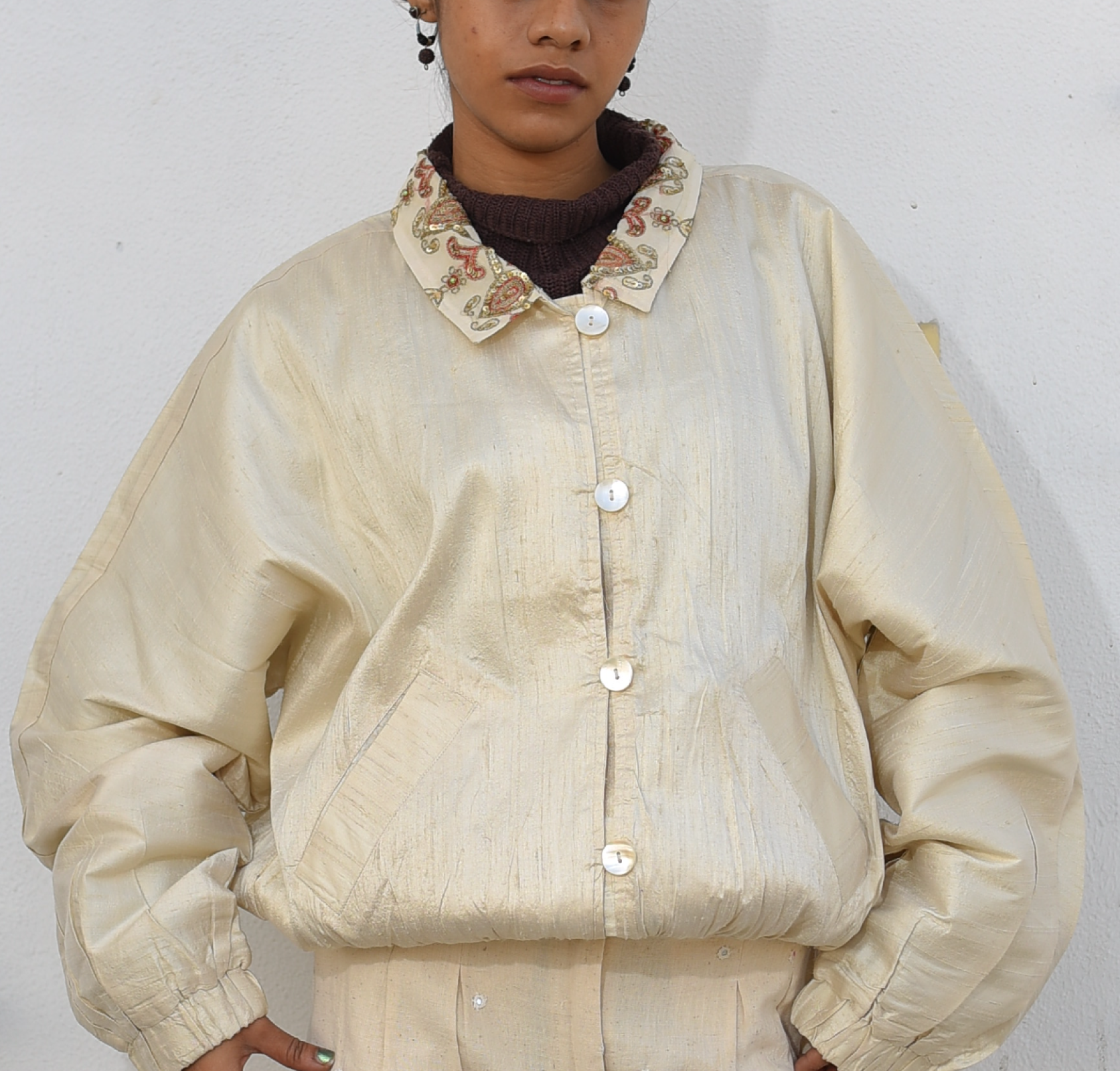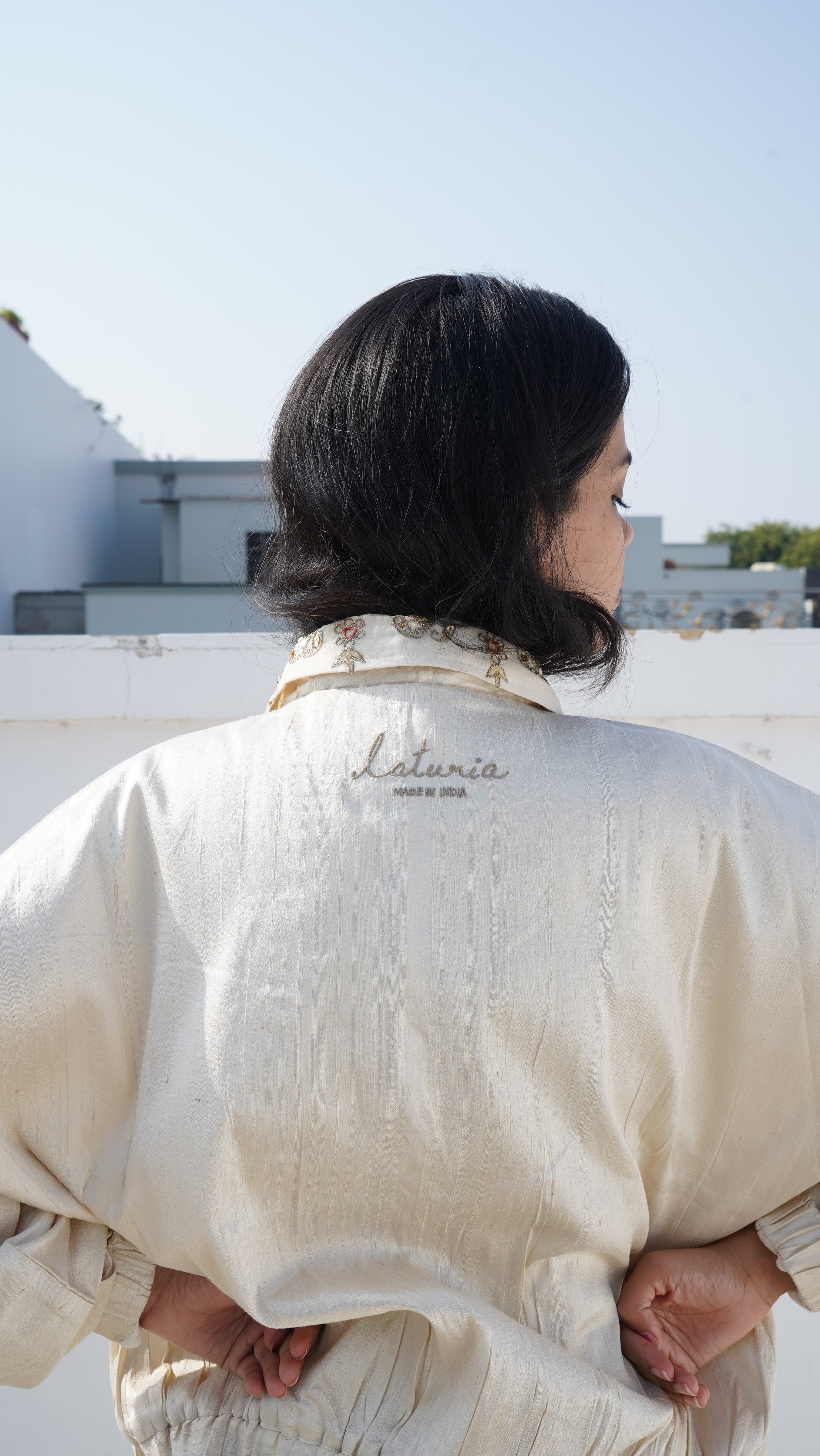 This jacket is crafted from handwoven raw silk, woven slowly on traditional looms to preserve the fabric’s natural irregularities and lustre. The collar is cut from a vintage hand-embroidered saree, upcycled from India’s textile archives — carrying traces of stories, ceremonies, and generations of craftsmanship.