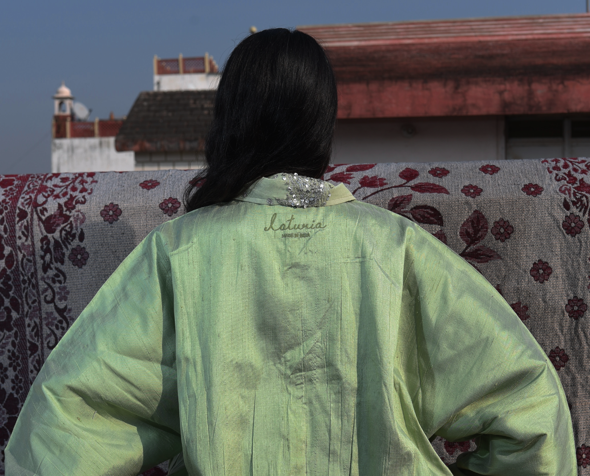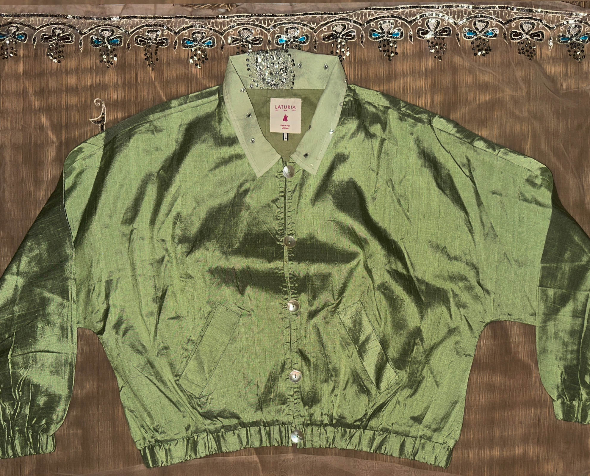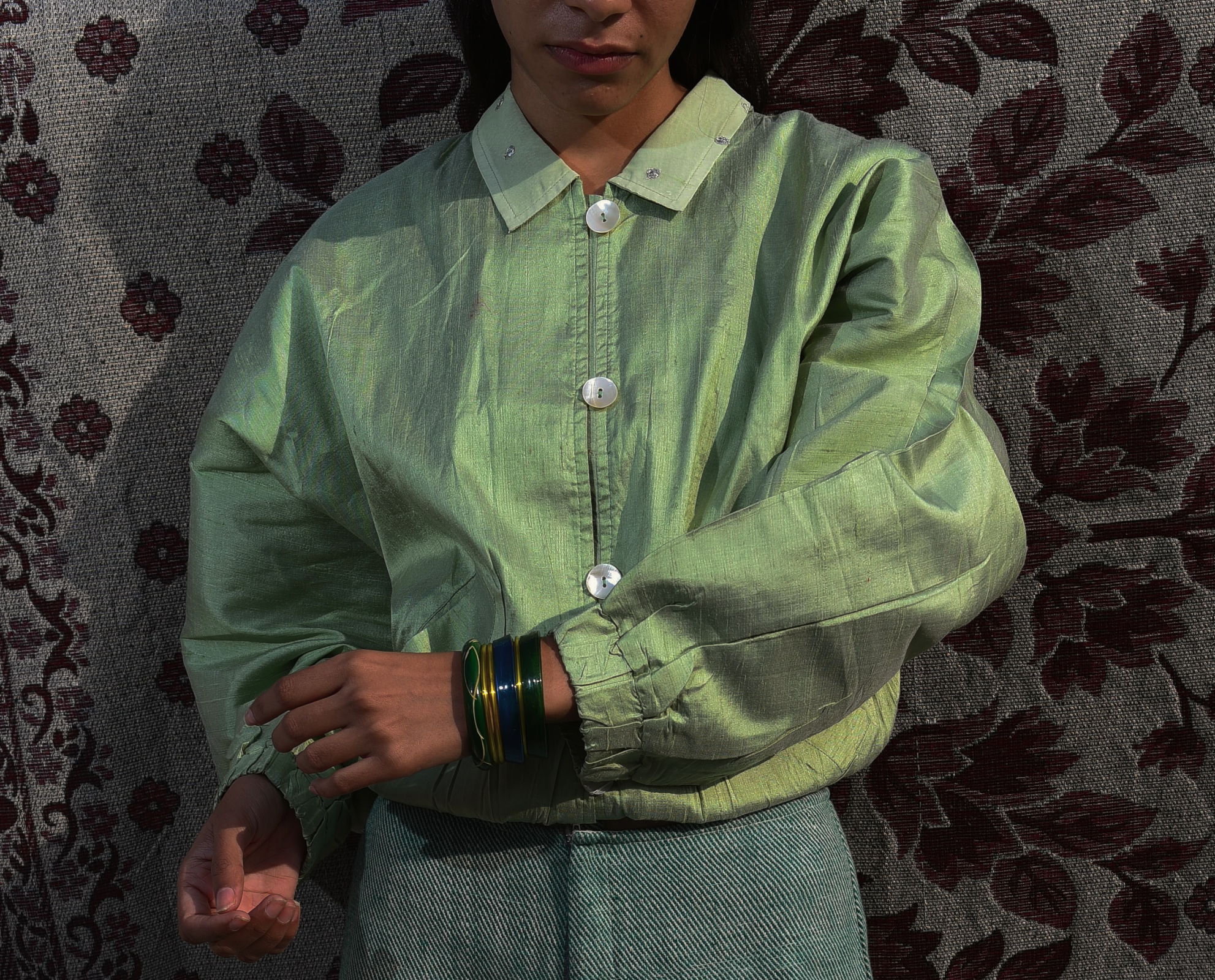 This jacket is crafted from handwoven raw silk, woven slowly on traditional looms to preserve the fabric’s natural irregularities and lustre. The collar is cut from a vintage hand-embroidered saree, upcycled from India’s textile archives — carrying traces of stories, ceremonies, and generations of craftsmanship.