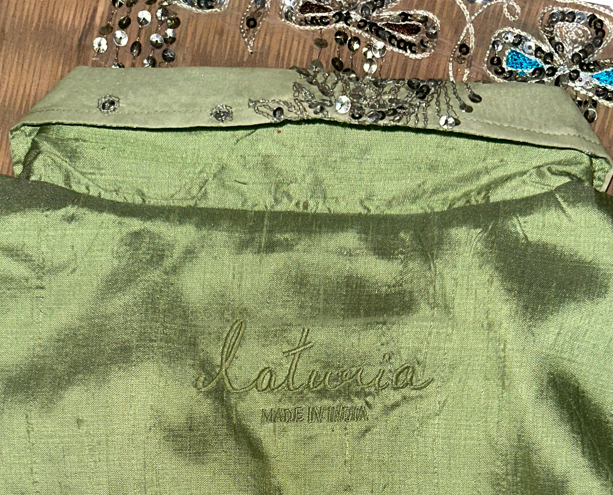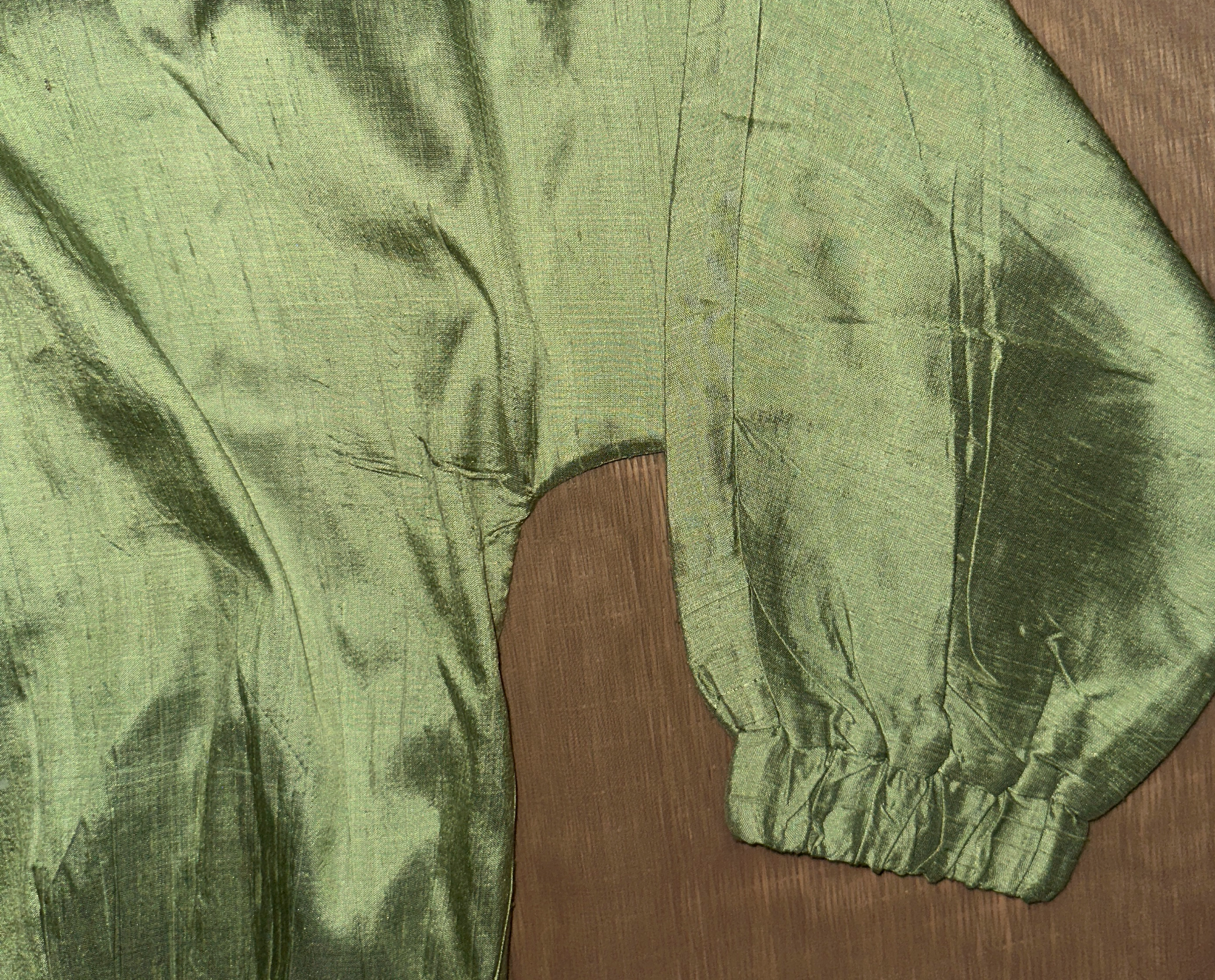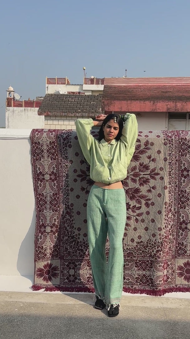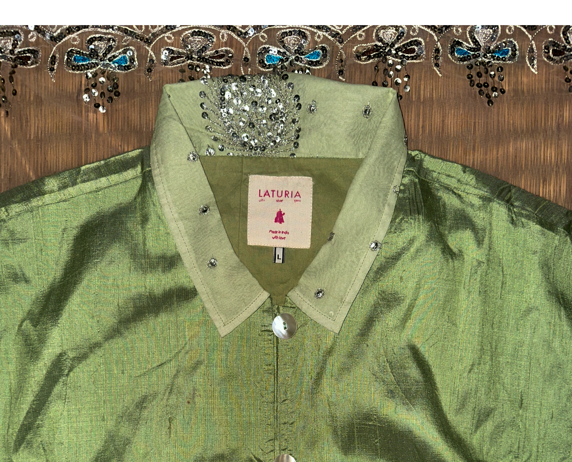 This jacket is crafted from handwoven raw silk, woven slowly on traditional looms to preserve the fabric’s natural irregularities and lustre. The collar is cut from a vintage hand-embroidered saree, upcycled from India’s textile archives — carrying traces of stories, ceremonies, and generations of craftsmanship.
