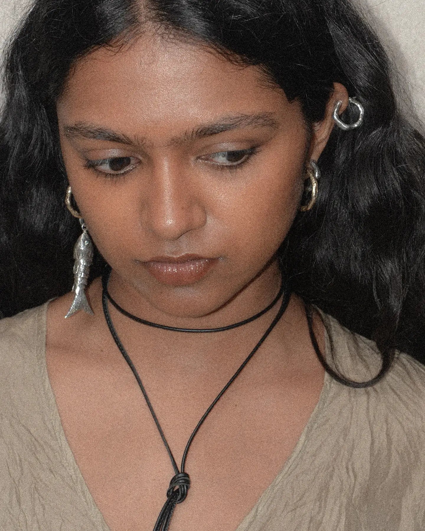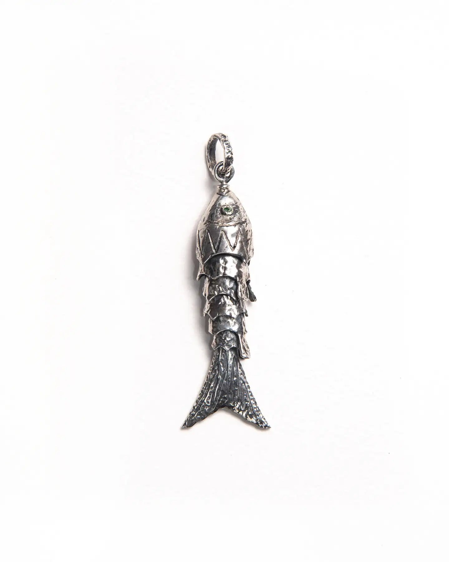 Handmade in Naples, Italy, this intricate, fish-shaped pendant in silver is a true ode to craftsmanship. With its textured finish and natural gemstone eyes, the piece draws inspiration from vintage jewellery, reimagined in modern lens.