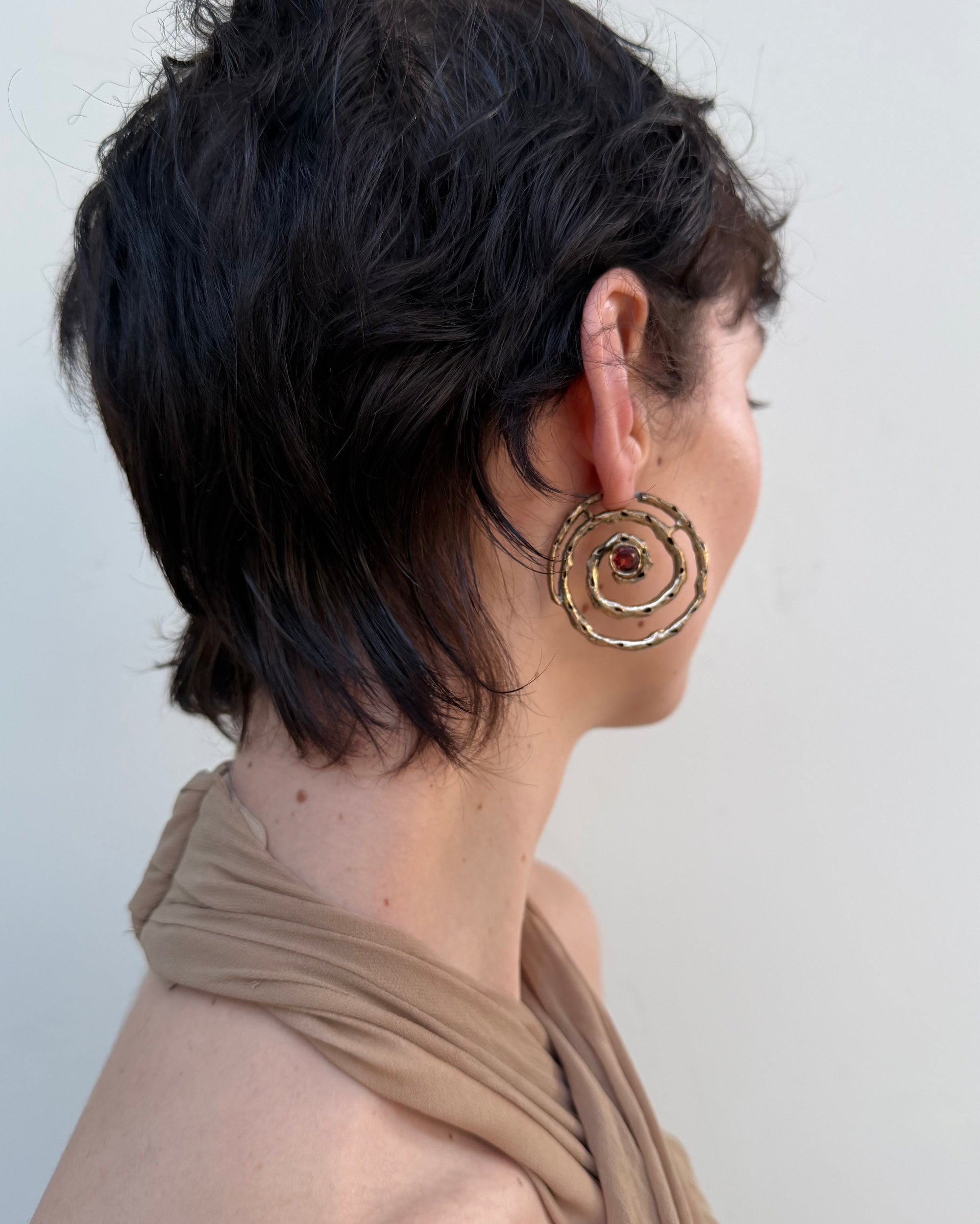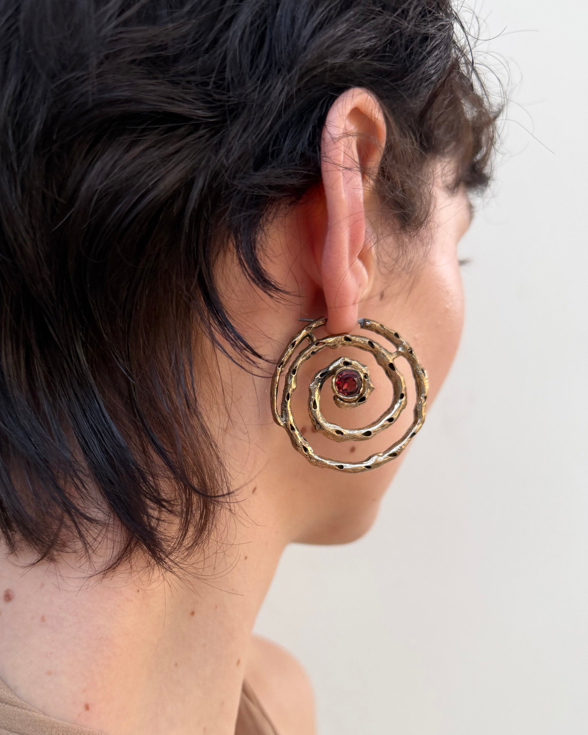 This is one of our most intricate pieces, thoughtfully designed with a hollow structure to ensure it remains light and comfortable to wear. The sculptural vortex form features drop-shaped openings that add an extra touch. Set with deep garnet natural stones, each earring glows with a rich, wine-red hue that adds warmth and intensity to the overall look.